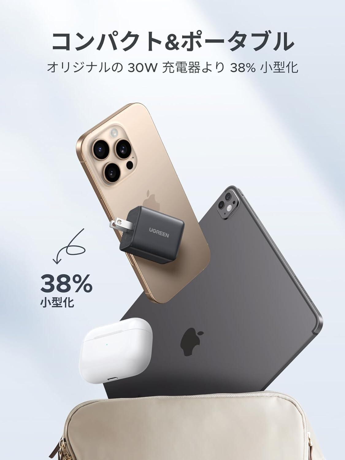 UGREEN 充電器 30W 2*USB-C+1*USB-A type-cPSE技術基準適合/PD3.0対応/30W急速充電/コンパクト GaN チャージャーアダプター iPhone16/15/14/