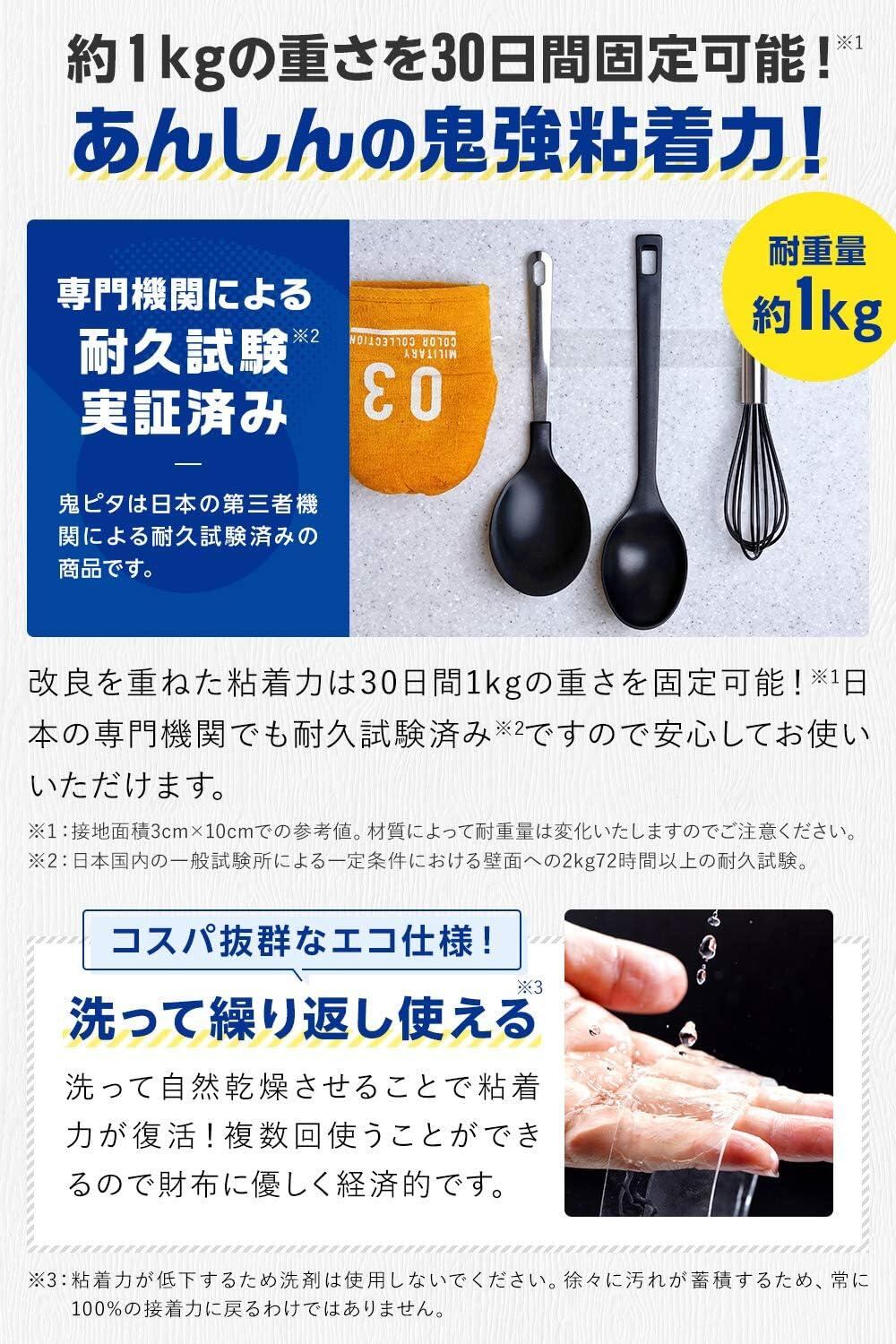 使用上の注意強力な 粘着力の為、柔らかい素材の 壁紙 などへ使用した場合、剥がせる際に粘着面を傷める可能性があります。粘着 面の素材・固定する物の大きさにより耐荷重は変動いたします。使用の際は、お客様の判断のもと十分注意してご使用願います。