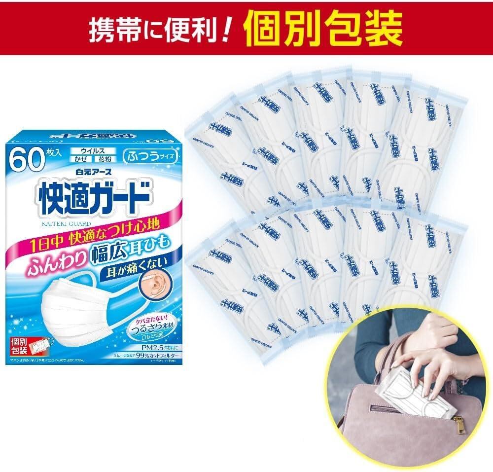 白元アース 快適ガード マスク ふつうサイズ 60枚入個包装 JIS規格適合 プリーツタイプ 耳が痛くならない幅広耳ひも ケバ立たない 不織布 花粉症 風邪
