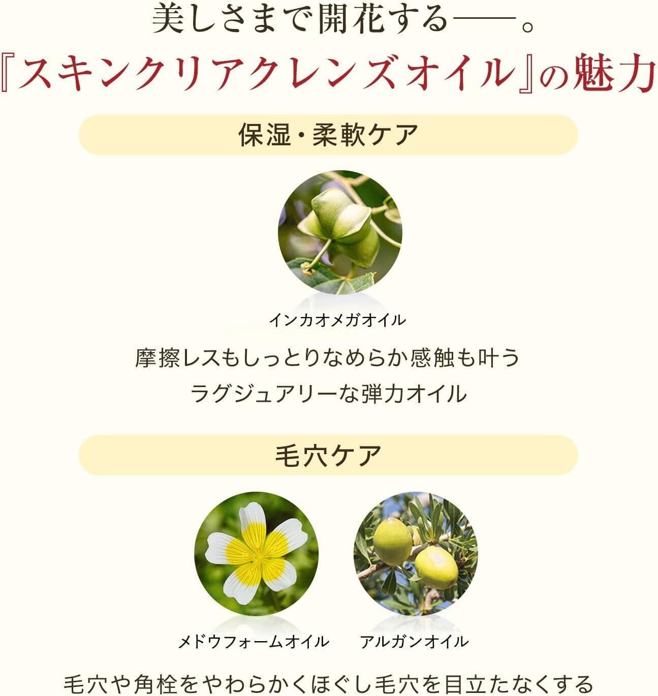 配合成分ククイナッツオイル・ホホバオイル・珊瑚草サンゴソウオイル・ロックローズオイル・イモーテルオイル古い角質によるくすみのない肌を保つエモリエント成分、メドウフォームオイル・アルガンオイル毛穴汚れ除去成分、インカオメガオイルバリア機能・うるおい補助成分配合。スピーディメルティング処方