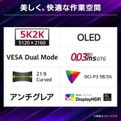 解像度@リフレッシュレート、表示サイズを選択可能 VESA Dual Mode グラフィックが豊かなゲームには5120×2160@165Hzを、高速表示が求められるFPSなどのゲームには2560×1080@330Hzと、シームレスに切り替えることができます。また、Dual Modeオプションをご用意。44.5インチから24インチまで、選べるお好みの画面サイズとアスペクト比21:9、16:9を簡単に選択できます。