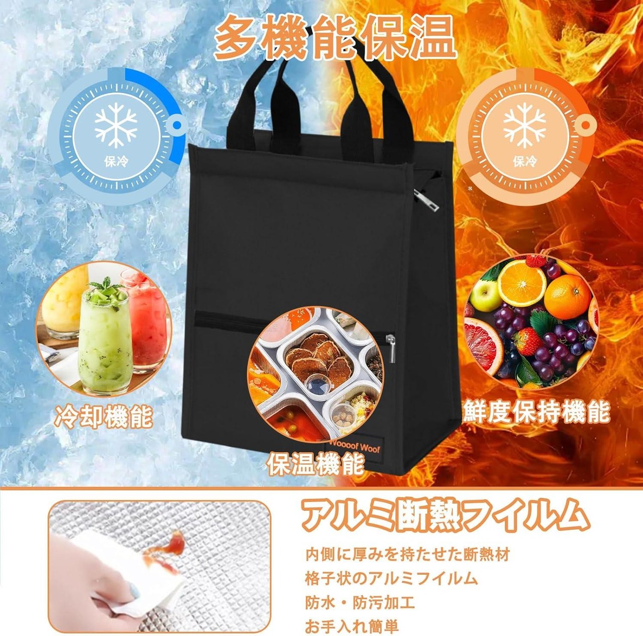 Woooof Woof 保冷バッグ 大容量 お弁当バッグ 弁当箱 収納 フロントジッパーポケット&持ち手付き 内側断熱 軽量 耐久性 男女兼用 通勤通学用