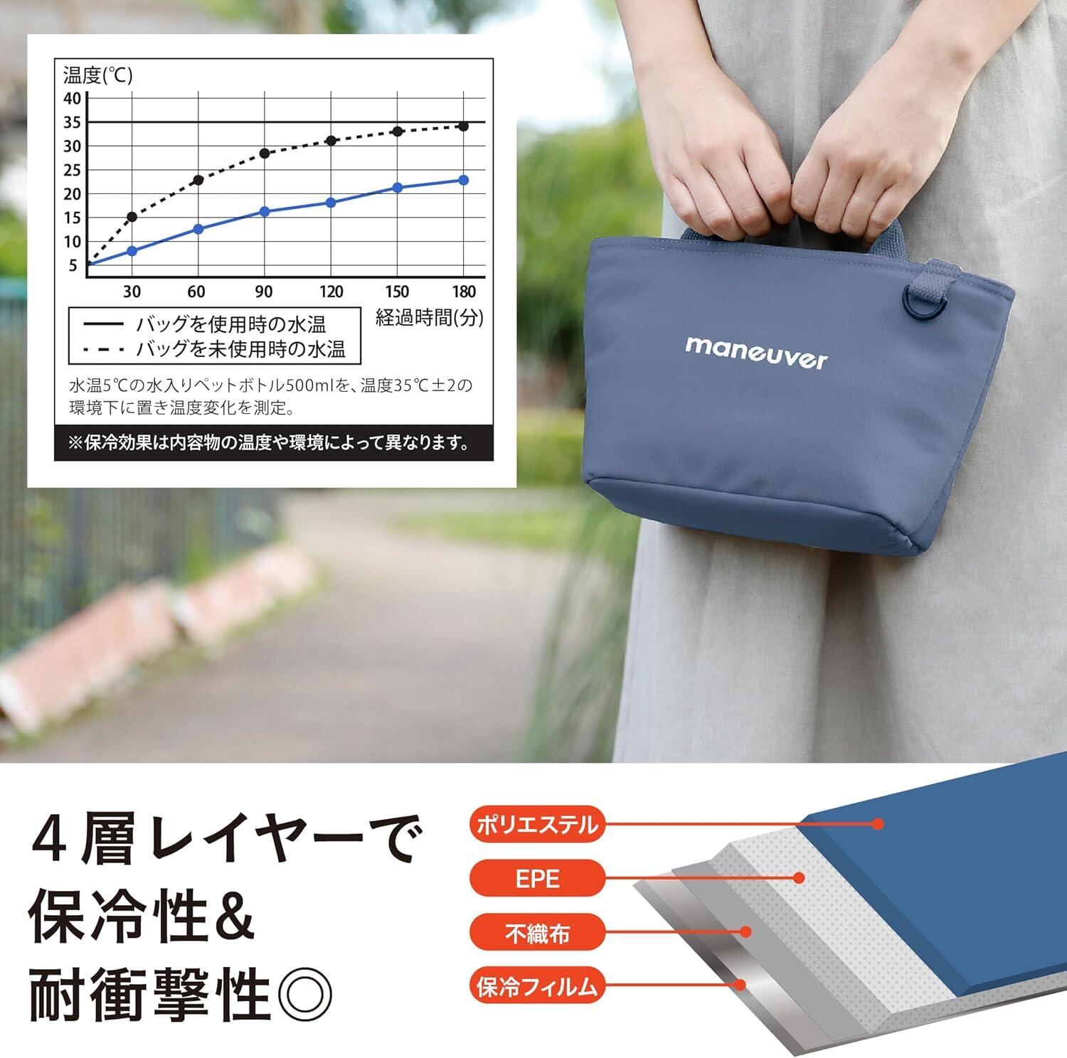 お弁当と水筒がピッタリなコンパクトサイズの「maneuverマヌーバ保冷ランチトートバッグS」横長で可愛らしいフォルムで、女性やお子様が持ちやすい。
