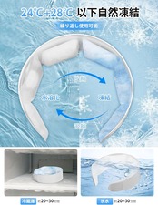 24℃+28℃自然凍結&首に巻くひんやり冷却リングアイスネックリングは、ネッククーラー、クールリング、クールネックリング、クールネック、ネックアイスバンドやネッククールリングとも呼ばれ、首周りを冷やすグッズです。クールネックリングは冷蔵庫や冷水で冷やすだけで、首の両側の結晶は24℃以下で自然凍結し、首の後ろ側の結晶は28℃以下で自然凍結する。電池や電源不要、冷やせば何度でも使えるエコ設計。首筋から効果的に冷やす!首元の広い範囲に触れるデザイン、ピッタリフィットで効率よく冷やす!固まるまでの時間が短く、便利にお使いいただけます。※こ注意:温度が非常に高い場合は、冷却時間を長くする必要があります。