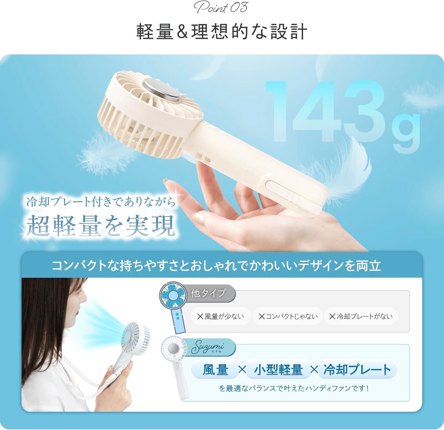 福岡県に本社を構えるベルモンドの「Suzumiすずみ」は、上品なくすみカラーと冷却プレートを搭載したハンディファンです。最大6.0m/sの風速で、コンパクトながらもパワフルな風を生み出し、暑い環境でもしっかりと涼しさを提供します。ペルチェ冷却プレートは触れると瞬時に-13℃の冷却効果を発揮し、外気温に影響されることなくひんやりとした涼しさを感じることができます。おしゃれなデザインと卓上扇風機にもなるフックスタンドで、野外だけでなくオフィスなどでも使用しやすいハンディファンです。