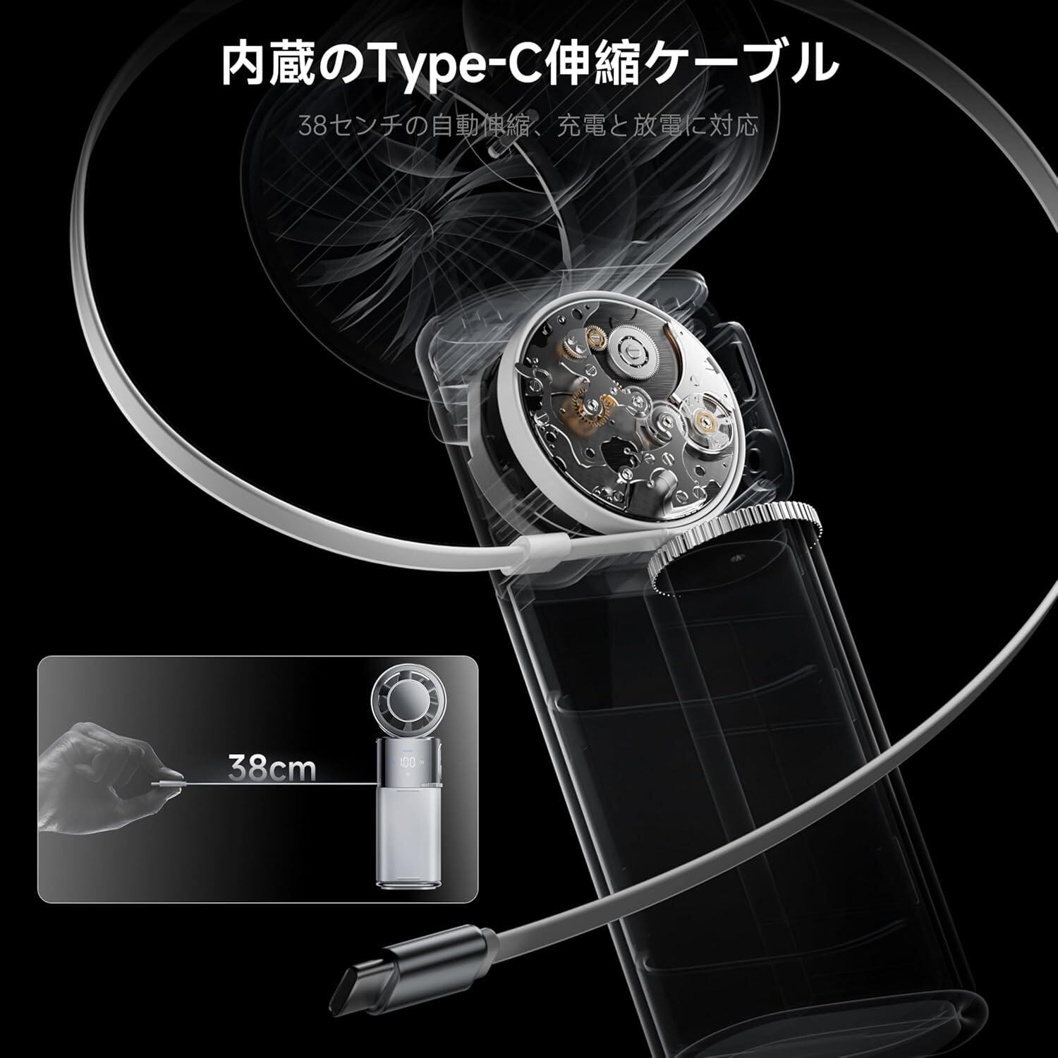 ▶ 内蔵 Type-C 伸縮充電ケーブル 本体に Type-C 伸縮ケーブル38cmを内蔵!充電時もスマホ接続時も、外部ケーブル不要