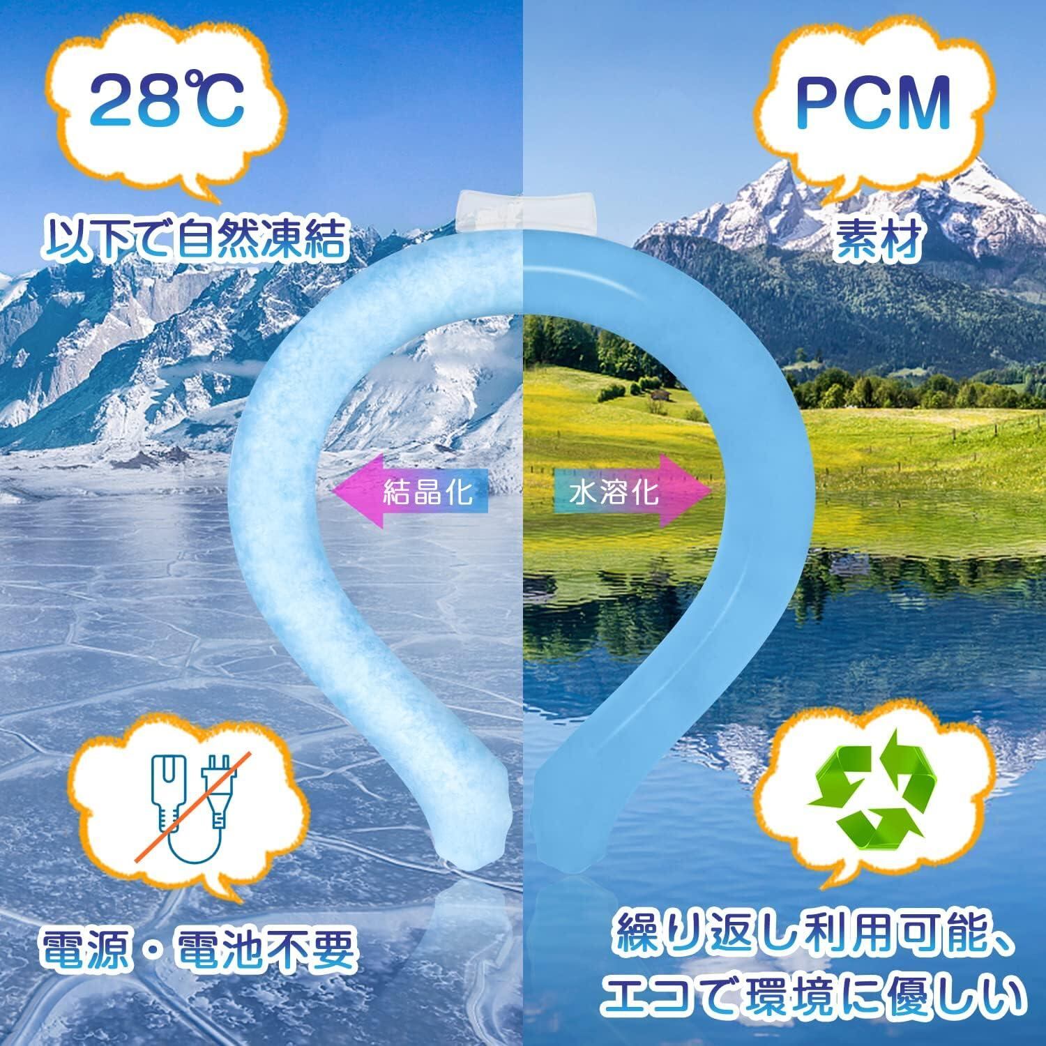28℃以下で自然凍結クールリングの内側はPCM素材を使用し、熱吸収性に優れている暑さ対策の必須アイテムです。クールネックは28℃以下になると自然凍結し、電源・電池などが要りません。何度でも繰り返し使える環境に優しいエコグッズです。