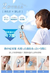 冷却プレート付きハンディファン蒸し暑い真夏を快適に過ごすに欠かせないひんやりグッズ。冷感プレートが搭載され、送風中にボタンを長押しすると冷却モードになり、わずか2秒で瞬間冷却、プレート部を頬やおでこ、手首、首元などに当てると、氷のような冷たさを感じられ、火照った肌を心地よく冷やしくれます。猛暑の中でも即時に冷え冷えを体感でき、汗による不快感を爽やかに、熱中症対策に最適な携帯ファンです。