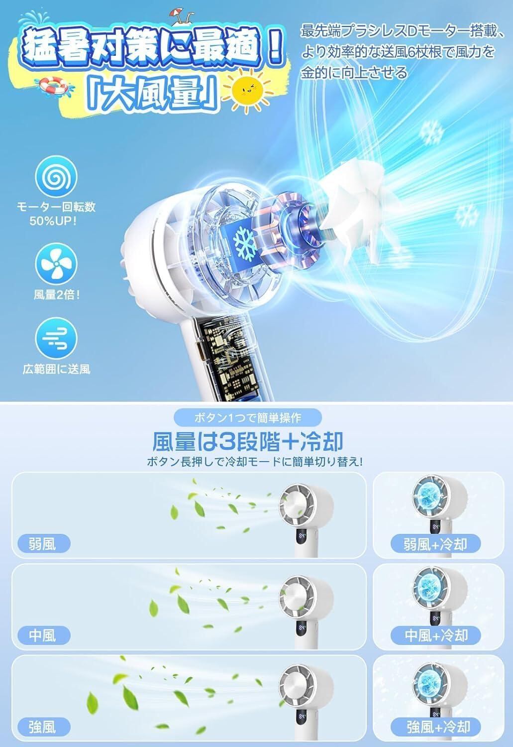 より静音!20db以下・3段階風量調整市販の一般的な手持ち扇風機と比べ、弊社の手持ち扇風機は放熱板、直流送風構造を採用し、6枚のファンブレードを追加することで、より強力な風力と広い給気範囲を実現しました。 強力だけど静音設計! 「優れた静音性」低ノイズBLDCモーターを採用することで、動作音を大幅に低減し、優れた静音性を実現しました。周りの人を邪魔する心配はありません。職場や図書館などの静かな場所で快適に勉強を楽しむことができます。 また、風量は3段に分けて自由に調節することができます:1段は柔らかい風で、2段は中風で、3段は強風で、夏の暑い日でも涼しさを感じることができます。