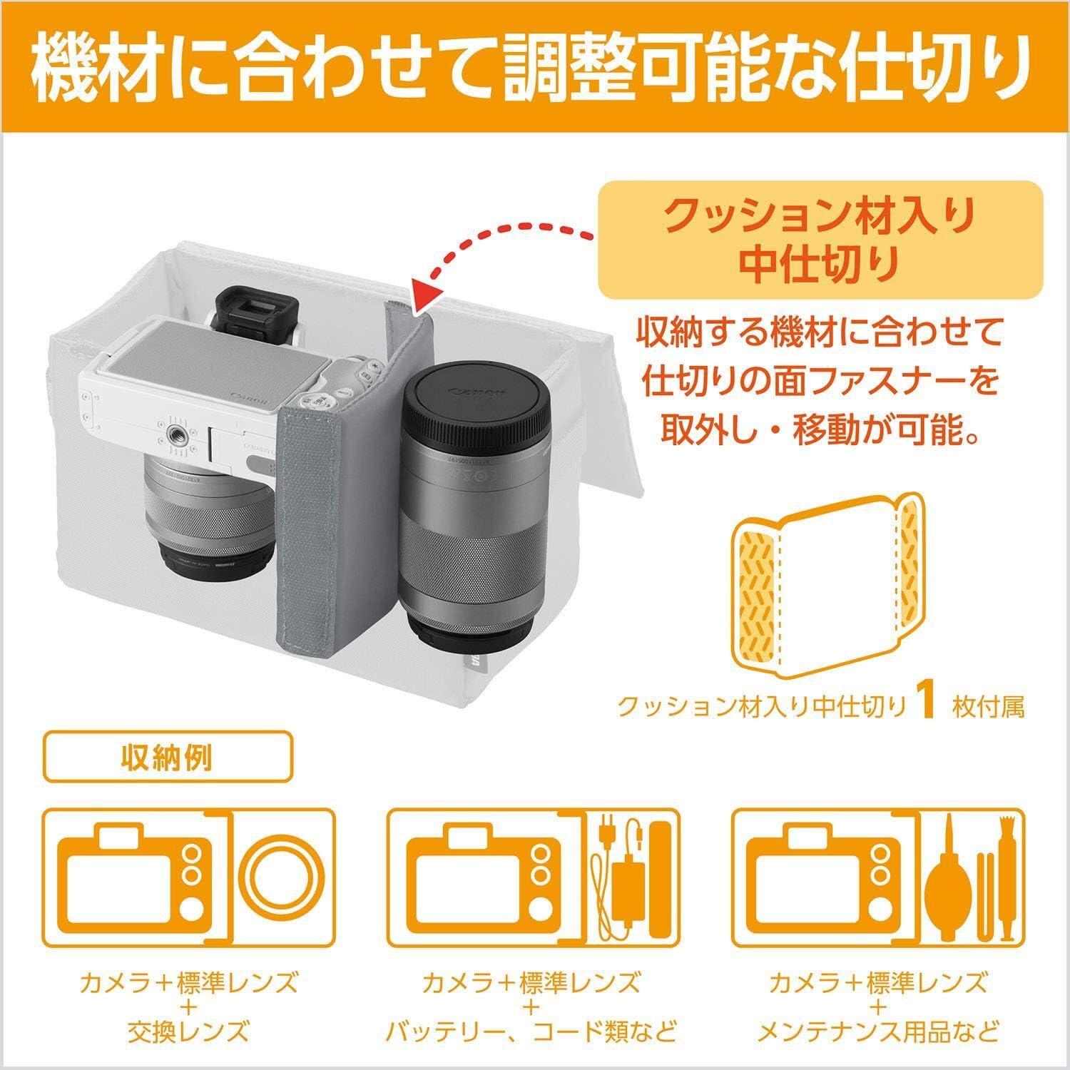 標準レンズ付き小型一眼カメラと交換レンズ一本の収納を想定したサイズ。機材に合わせて移動できる仕切りが1枚付属しています。