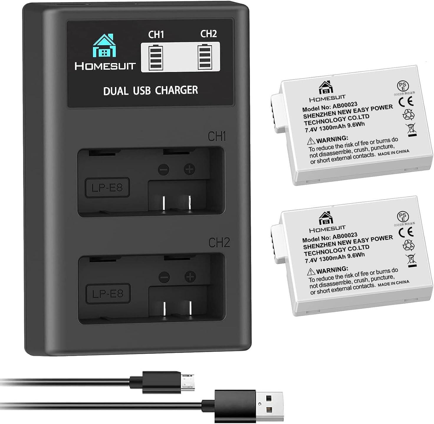 Homesuit LP E8 LP-E8 互換 バッテリー 1300mAh 2個入り LCD 充電器セット同時充電対応 USBケーブル付き 対応機種 Kiss X5 X4 X6 X7i Rebel T