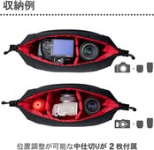 標準レンズ付き小型一眼レフカメラと交換レンズ1本、もしくはミラーレスカメラと交換レンズ1本~2本の収納が可能です。機材に合わせて位置調整が可能な中仕切りが2枚付属します。