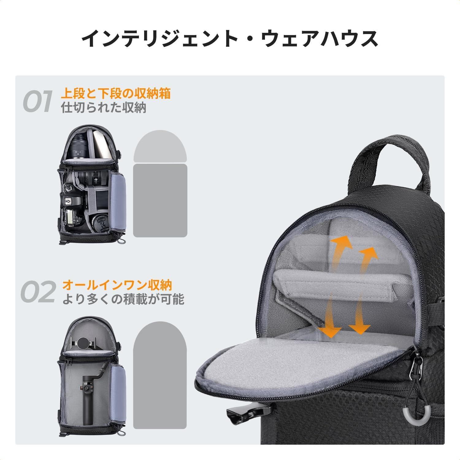 【収納便利 スリングバッグ】120°ジッパー大開口なデザイン、素早くカメラレンズや本体を取り出せますし、収納しもやすいです。持ち運び時に短時間でカメラを手に入れる可能、美しい瞬間を捉えることができます。また、カメラバッグ ショルダー の内部には組み合わせ可能な仕切れ板があります、ご自由に組み合わせることができ、収納がより便利です。