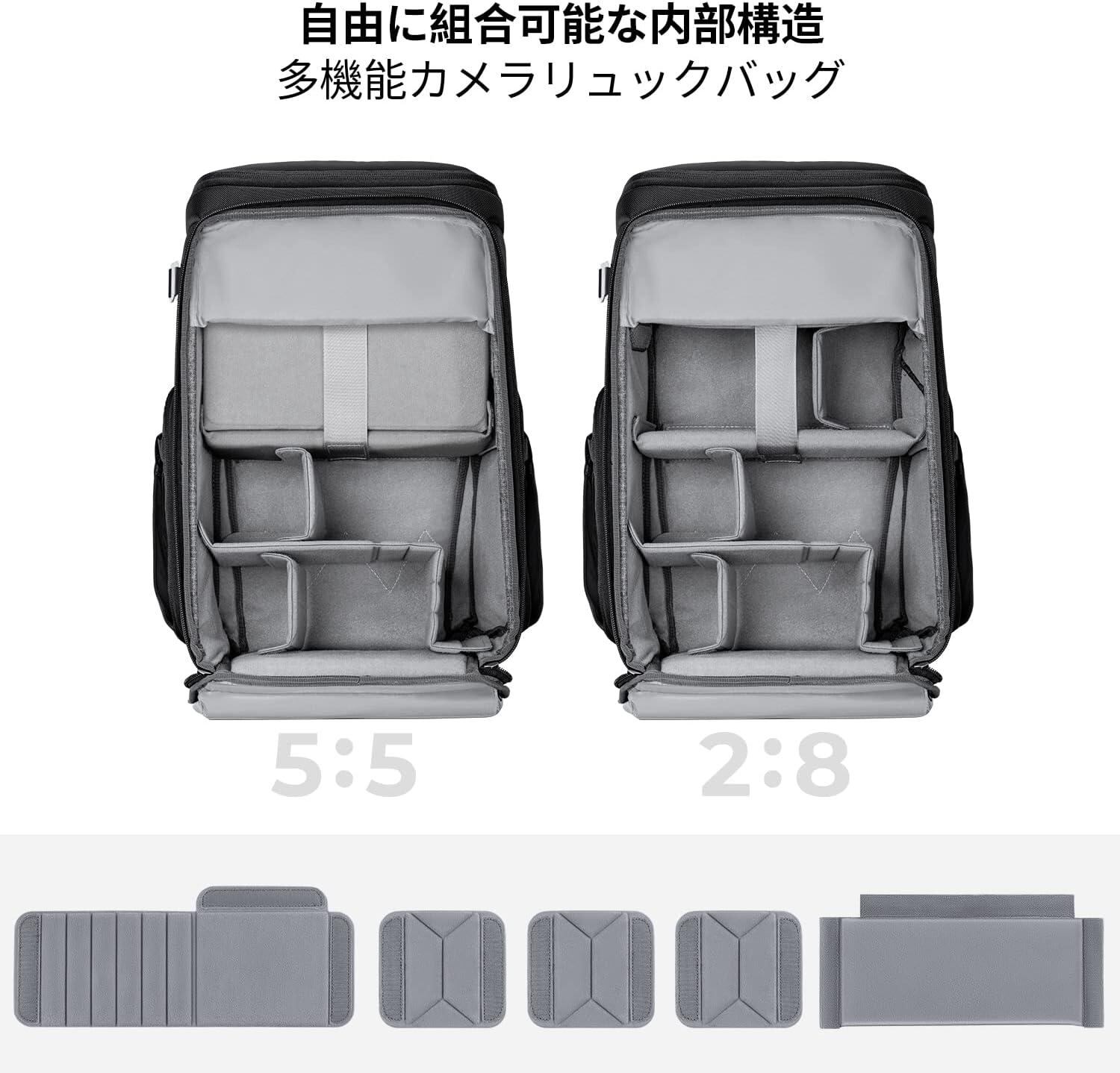 【サイドアクセス】片側のチャックから簡単にアクセスでき、撮りたいと思った瞬間に即取り出せ可能の大容量 カメラリュックです。様々な機材のサイズに適応するように上下にプッシュでき、プッシュ範囲は50:50から20:80に変化できます。内部は上下2室構造で、カメラ収納部は前からアクセスするようになります。上部コンパートメントのサイズは、上部仕切りを調節することで変更され、望遠レンズやビデオライトスティックなどの機材を簡単に収納可能です。