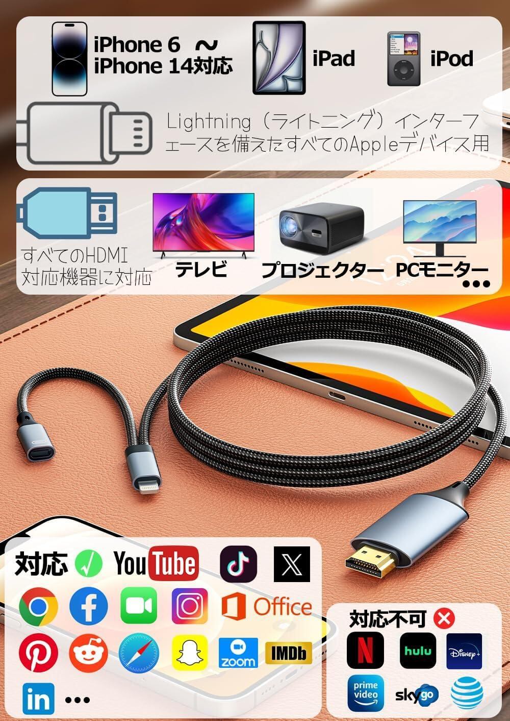 iPhone hdmi変換ケーブル MFi認証品 2025新登場業界新設【2K@60Hz高解像度映像出力、0 遅延】MFi認証済みのLightning HDMI 変換ケーブルは純正チップを搭載しており、iOSをアップデートするとiPhoneミラーリングも正常に使用できるようになります。このライトニング hdmi 変換ケーブルは、2K@60Hz・HDRの高解像度出力で、ワイドスクリーンテレビ、プロジェクター、その他のHDMI対応ディスプレイに高解像度映像とクリアな音声を同時にミラーリングできます。音声同期、遅延ゼロで、ホームエンターテイメント、ビジネス、教育、トレーニングなど、様々なシーンに最適です。