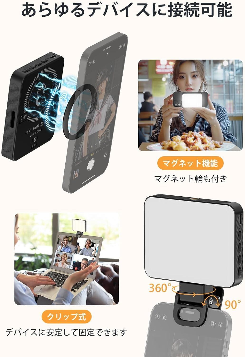 【マグネット&1/4ネジ穴】ビデオライトはマグネット機能がありますMagSafe対応。マグネット輪も付いており、簡単に吸着します。ライト本体にも1/4ネジ穴により、三脚に接続可能です。自撮りライトだけではなく、カメラライト、撮影照明用、オンライン会議、生放送、スタジオ照明、美容化粧、ビデオ通話など様々なシーンで活躍です。