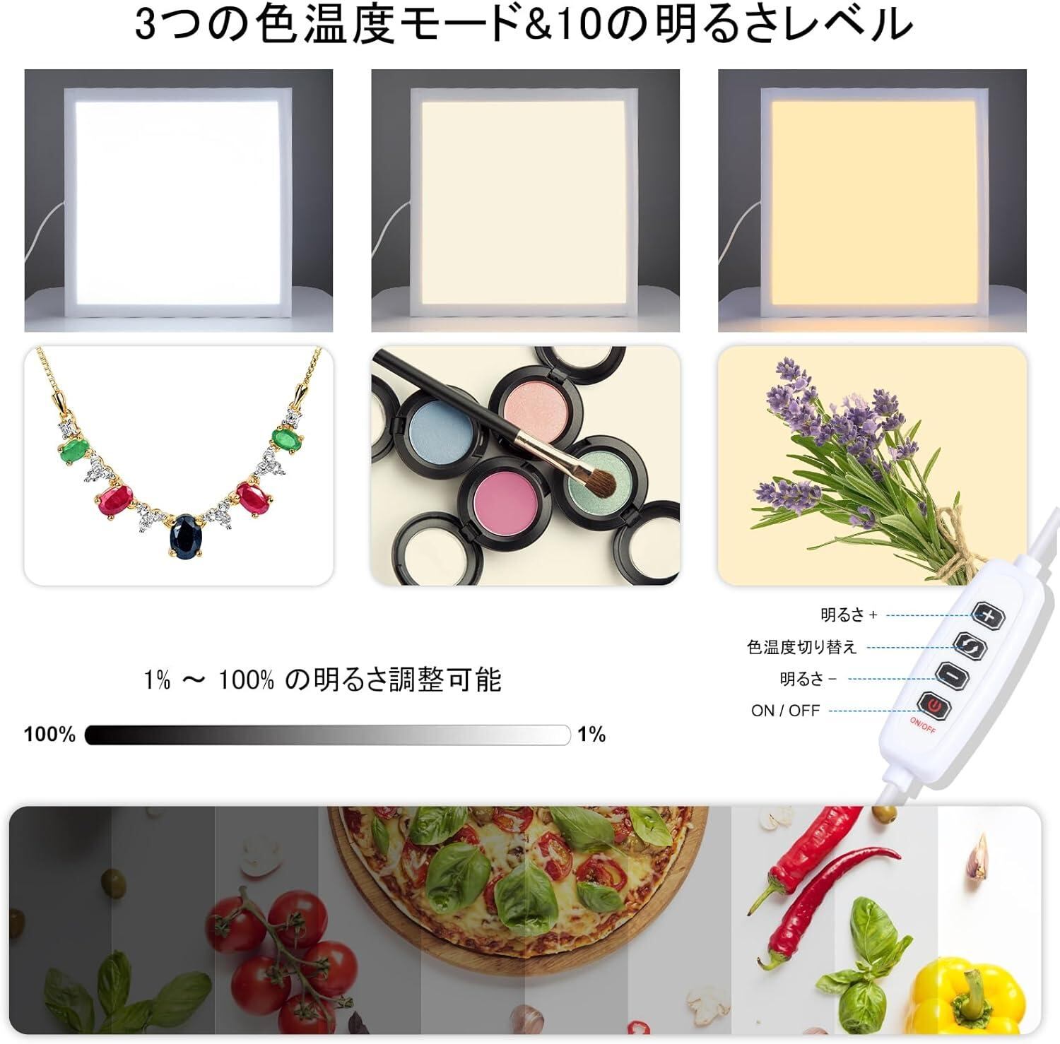 【広く適用性】このLEDライトパネルはライトスタンド三脚または撮影ボックスと組み合わせて使用でき、様々な環境で優れた照明効果を発揮します。スタジオの中で、ソフトで均一な照明を提供し、ジュエリー、化粧品、スケールモデル、芸術作品、ガラス製品、電子製品等さまざまな商業用製品の撮影に最適です。