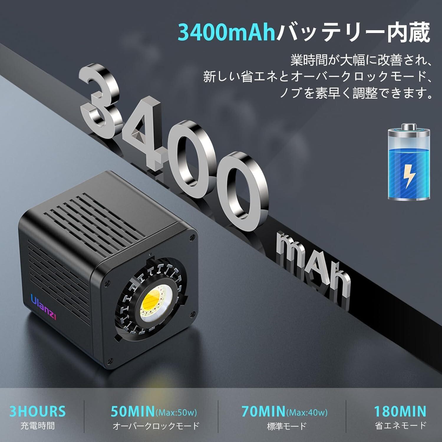 【40Wの強力発光パワー・3400mAhバッテリー内蔵・超高輝度】このCOB撮影用ライトは、高品質のLEDビーズを採用により、出力は40Wで、最大出力は50Wで、3400mAhバッテリー内蔵し、屋外に持ち出して無電源使用が可能、安定に出力することが可能になります。2500K-6500Kの色温度で、裸の光源の最大照度は9100Lux / 0.5mです。シーンやお手持ちの照明器具に合わせた色温度を調整が可能、映るもの本来の美しいを復元します。小さなポータブルCOBライトを巨大なパワーライトに変身させることができます。
