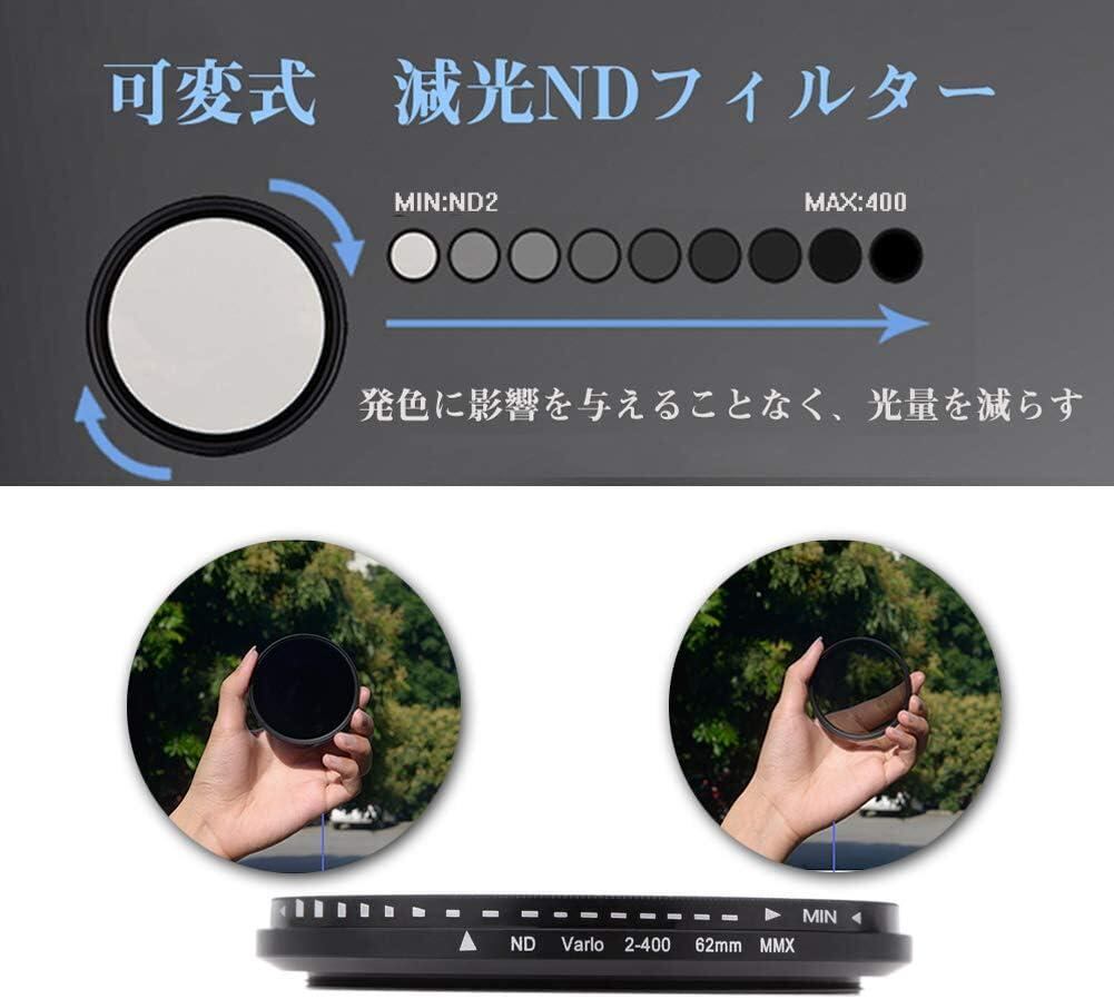 Junder 可変式 62mm減光NDフィルター 減光範囲ND2-ND400 薄型 X状ムラなし 光量調節用 62mm レンズフィルター 62mm