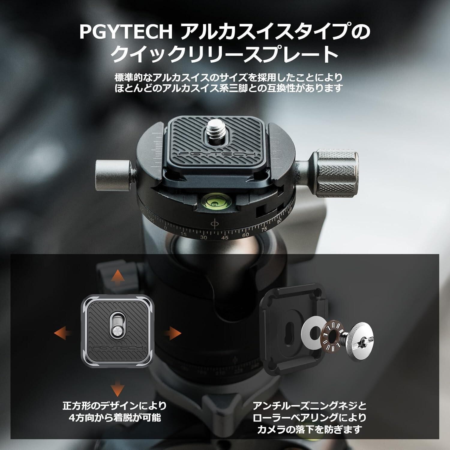 PGYTECH アルカスイスタイプのクイックリリースプレート;標準的なアルカスイスのサイズを採用したことにより、ほとんどのアルカスイス系三脚との互換性があります。 ・正方形のデザインにより4方向からの着脱が可能です ・アンチスリップラバーパッドはグリップ感を高め機材を保護します ・特許取得済みのアンチルーズニングネジとローラーベアリングはカメラを安全に固定し、スリップやドロップを防ぎます