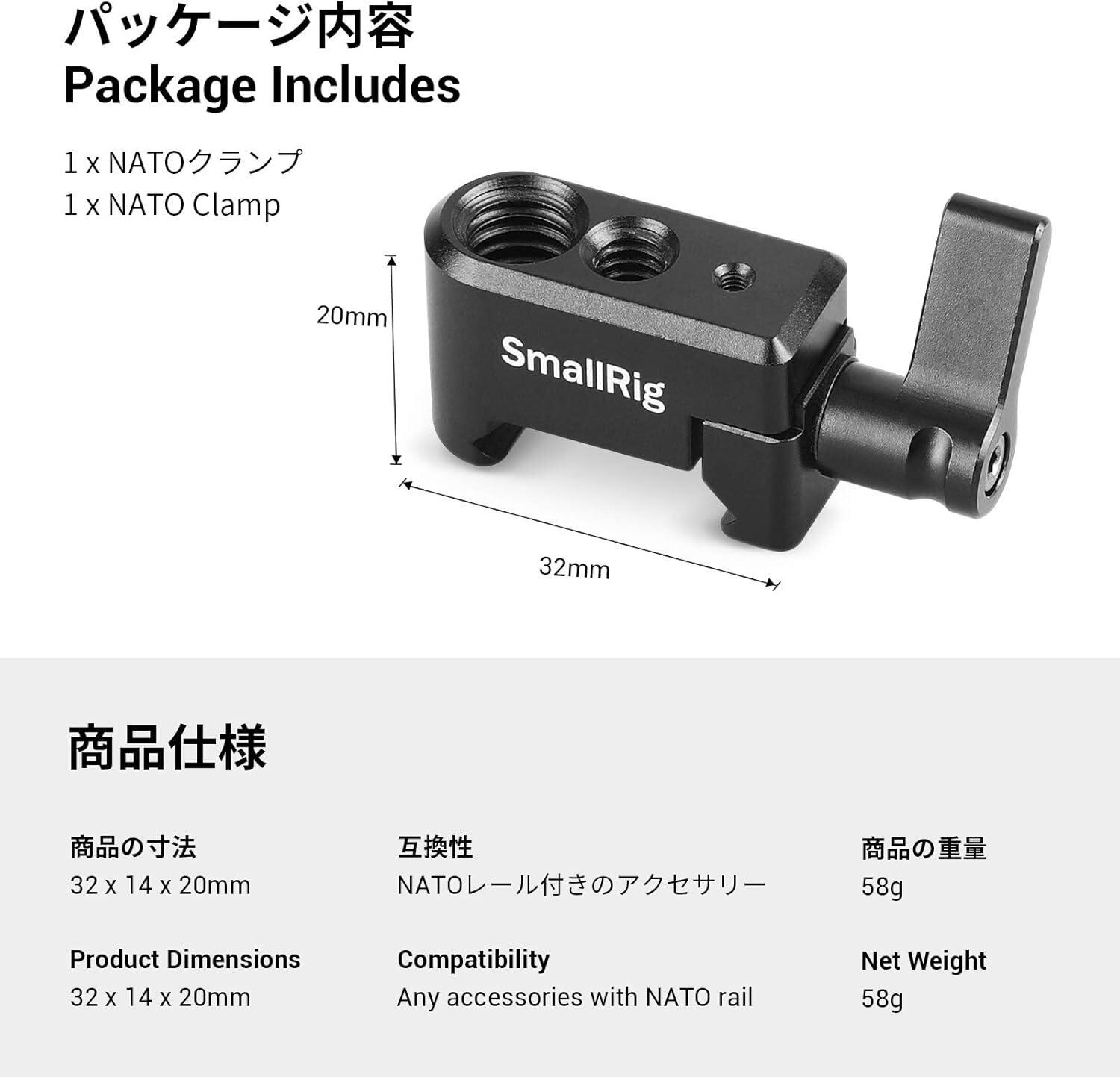 【互換性】このクランプは、1/4”-20の位置決め穴を備えたすべてのアクセサリに取り付けることができ、NATOレールを備えたすべてのSMALLRIGケージにシームレスにフィットし、多目的な取り付けオプションを提供します。注:この製品はSMALLRIG HawkLock H21クイックリリースNATOクランプと互換性がありますが、クイックリリース機能はサポートしていません。