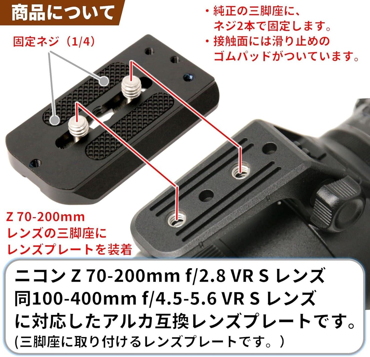 【商品の概要】Nikon ニコン Zマウント 望遠ズームレンズ Z 70-200mm f/2.8 VR S レンズ と同 Z 100-400mm f/4.5-5.6 VR S レンズに対応した アルカスイス互換形状のレンズプレートです。【商品の特徴】 該当レンズは雲台に取り付ける際は、ネジ止め式ですが、本品を使用する事で、ワンタッチで雲台への取付、取外しが可能となります。純正の三脚座の底面寸法に合わせた専用品です。
