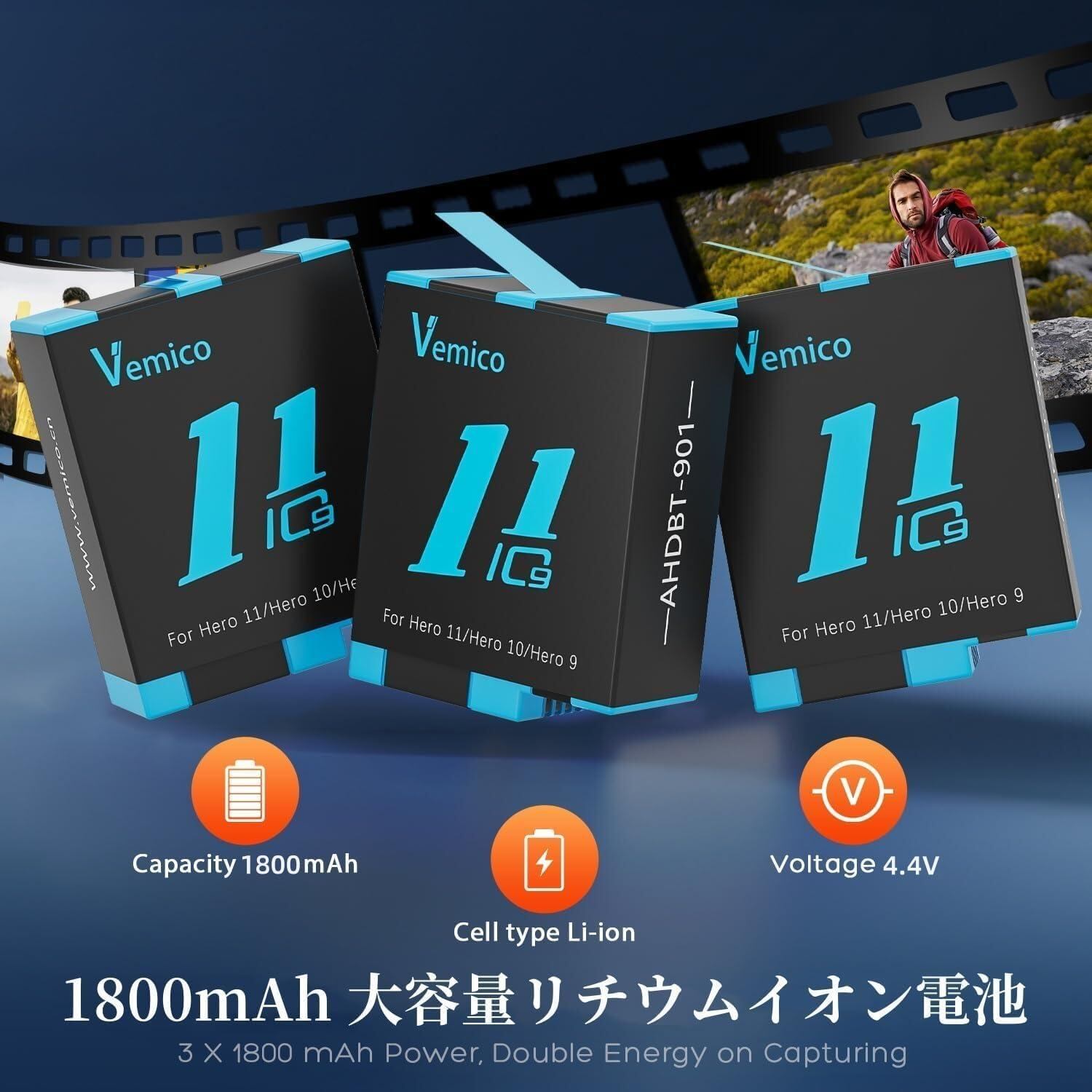Vemico Hero 11バッテリー 急速充電器セット 3*1800mAh大容量電池 Hero 9/10/11/12ブラック用 3個セットヒーロー11予備バッテリー チャージャー 同時充電可能 Ty