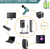 「幅広い互換性」本体の5.5x2.1mmのDCプラグのほか、11種類の変換ジャックも付き、カメラ、エアコン、オーディオ、マッサージガン PCモニターなどDC15V0〜3A規格の製品には給電用電源としてご利用させていただけます。「買う前にご対応するデバイスのDCプラグ口のサイズと極性を必ずチェックしてください、電源アダプターのDCプラグにぴったりすることを保証しなければなりません」。