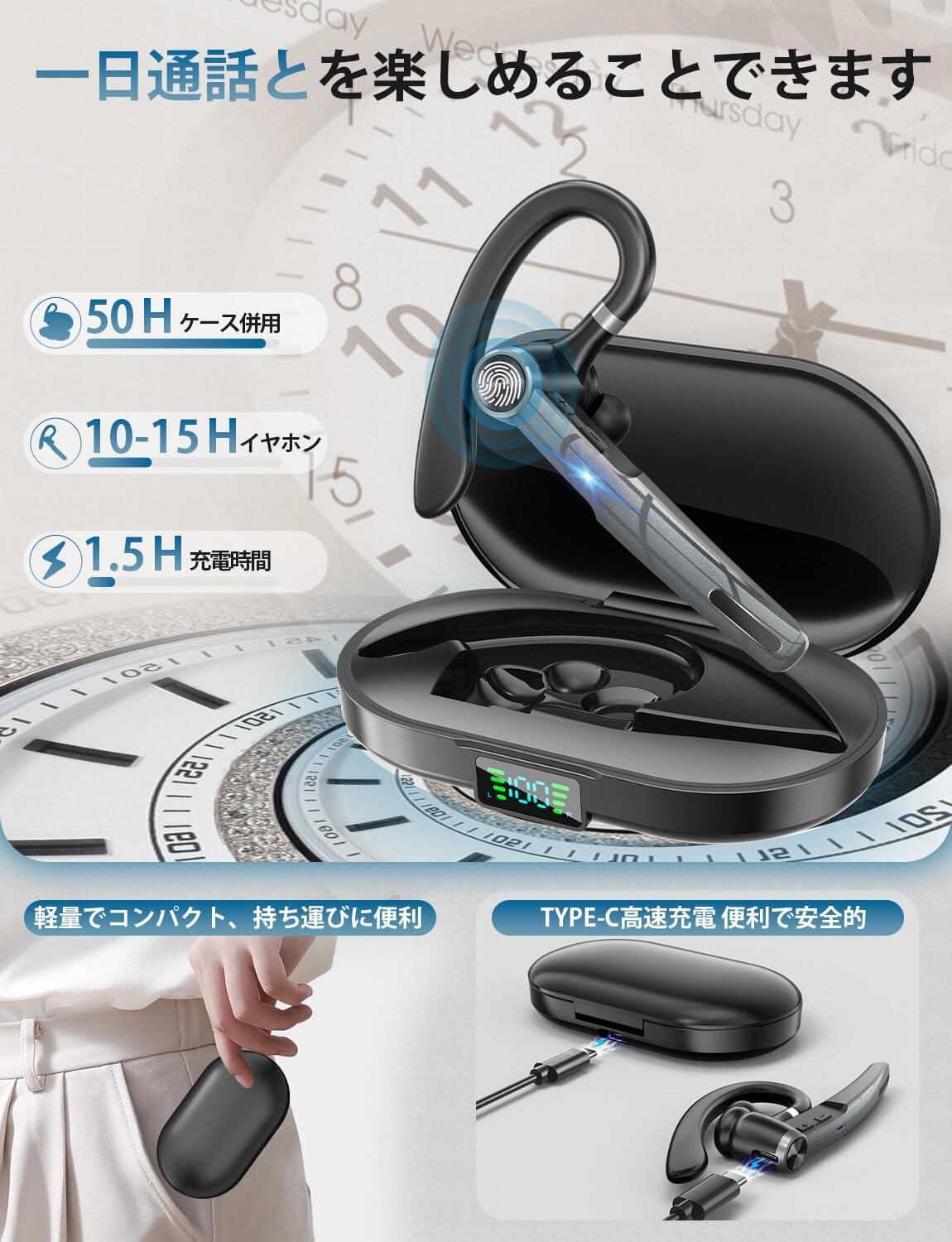 2025年大好評の革新版耳掛け型Bluetoothヘッドセットが日本に上陸!! 【50時間超長連続作動&高級感溢れたLEDバッテリー残量表示】 2024年おすすめランキングでTOP⬆⬆⬆独自開発された革新的な省電力技術と高性能バッテリーを搭載することで、イヤホンが充電1回で約10-15時間以上の連続再生を実現、500mAhの充電収納一体のケースが付いて、充電ケースと併せて最長50時間再生可能、一日中は心配なく使えます。充電ケースのバッテリー残量を充電ケースでの残量を一目で確認することができます。業界最新なチップを採用されていますので、後どのくらい残量があるかがLEDスクリーンで1%から100%迄の数字ではっきりと表示されます。⚡【急速充電】市販の最適なTypeC急速充電ケーブルを組み合わせており、転送スピードが伝統的なMicro USBより約2倍速くなって、約1.5時間でフル充電できます。ご注意:再生時間は充電時間、音量調整、再生内容、使用環境、個人使用習慣、接続デバイスなどによって異なる場合があります。