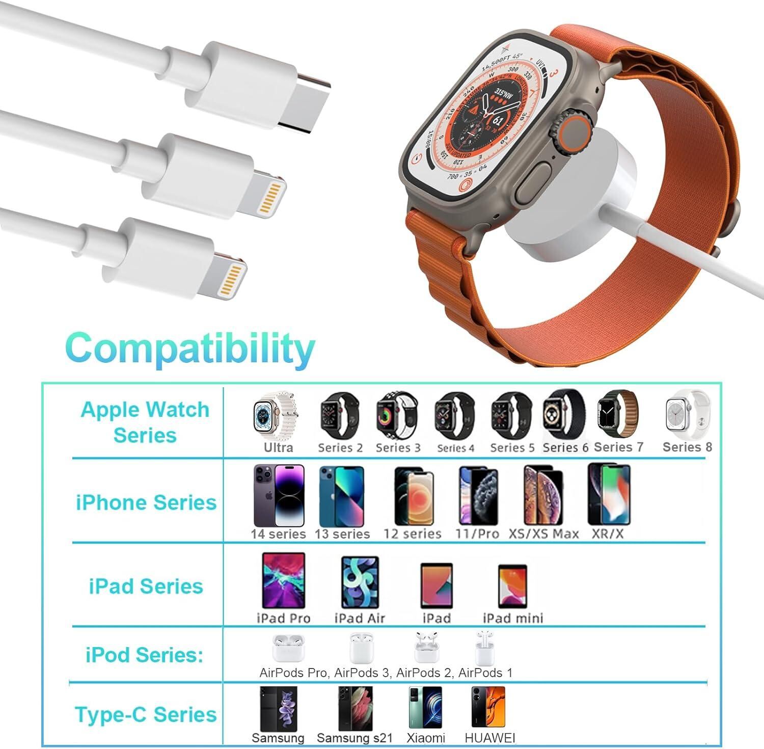 ⌚【軽量で持ち運び便利】このiWatch充電ケーブルキットは軽量で持ち運び便利なデザインで、旅行カバンやポケットに入れて持ち運んだり、自宅やオフィスで使ったり、いつでもどこでもアップルウォッチやiPhoneを充電することができます。1本のケーブルで複数のデバイスを同時に充電できます。どんな品質問題でも、30日以内に返金または新しい交換品をお送りすることをお約束します。