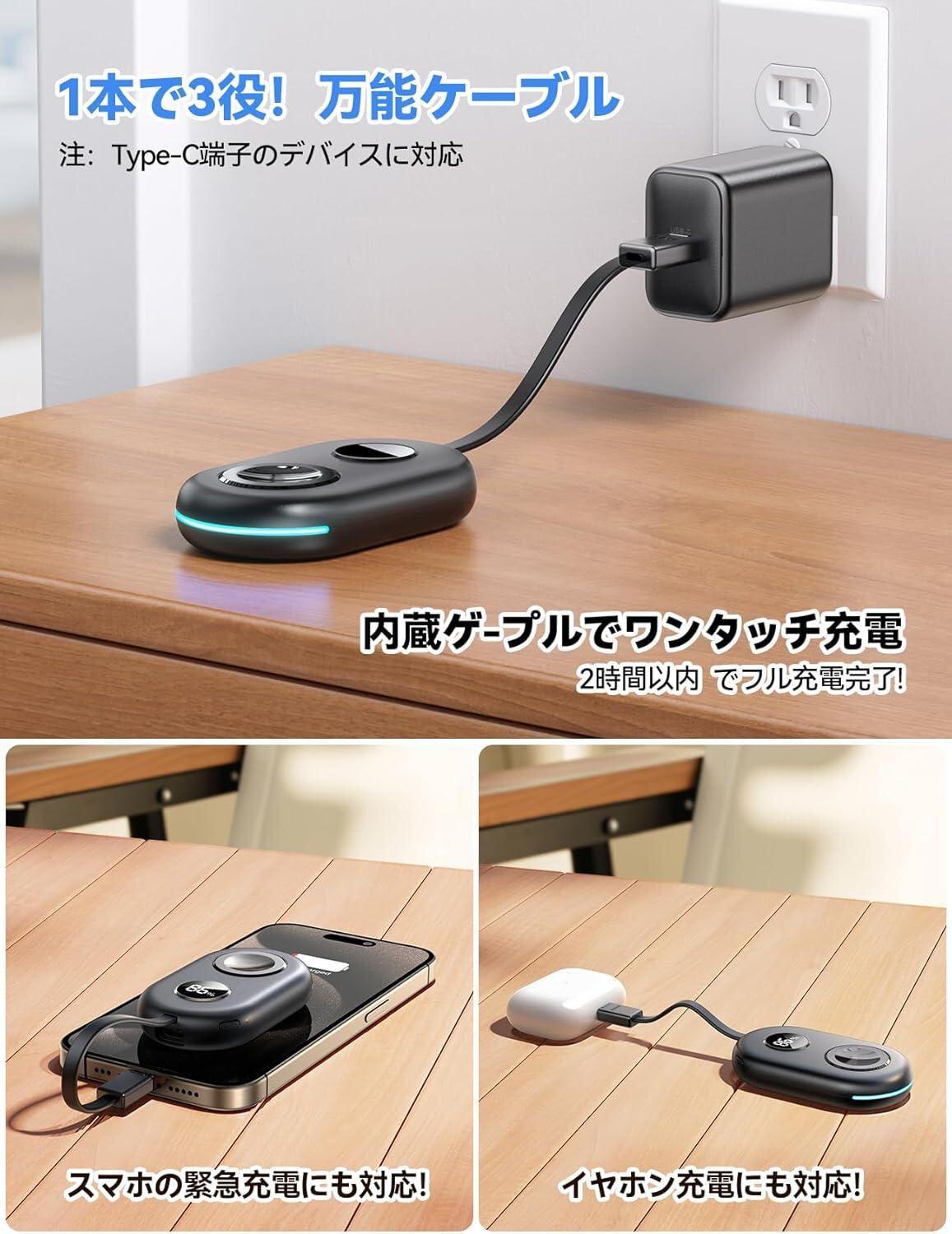 【2in1 USB C充電ケーブル内蔵!キーホルダー収納デザイン!】内蔵のUSB-C入力および出力充電ケーブルの2-in-1設計で、入力はApple Watchモバイルバッテリーの充電に使用し、出力はAirPods ProやUSB-C対応のデバイスの緊急充電に対応します。2台のデバイスを同時に充電できます!ケーブルをモバイルバッテリーに接続してリングを形成し、ケーブルはキーリング収納設計で、バッグに取り付けるのも簡単で、超コンパクトでアウトドアや旅行に便利です。Apple watch 充電器の理想的な選択です!