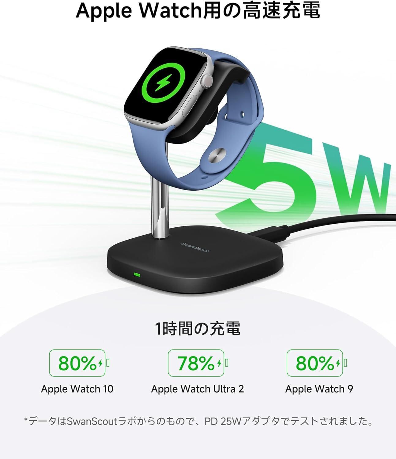【Apple Watch対応の高速充電】もう遅い充電に悩む必要なし! このアップルウォッチ 充電器は、Apple Watch 10を1.3時間で100%まで充電します。通常のアップルウォッチ 充電器よりもはるかに高速です。