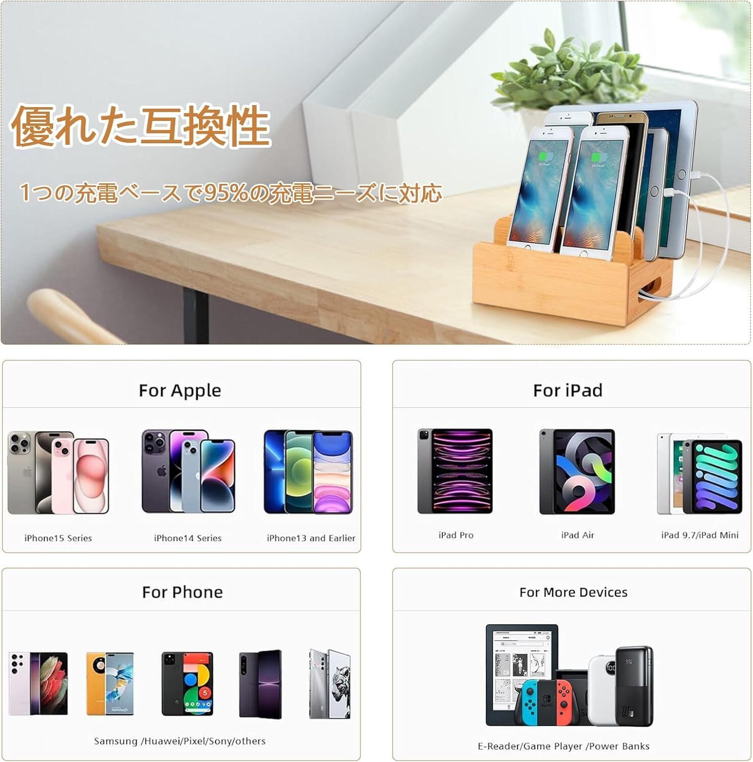 aleawol 充電ステーション 竹製 6台同時充電 卓上 スマホスタンド 充電スタンド 複数 Usb モバイル機器をスッキリ収納 スマホ充電台 iPhone/iPad/Galaxy/Android/