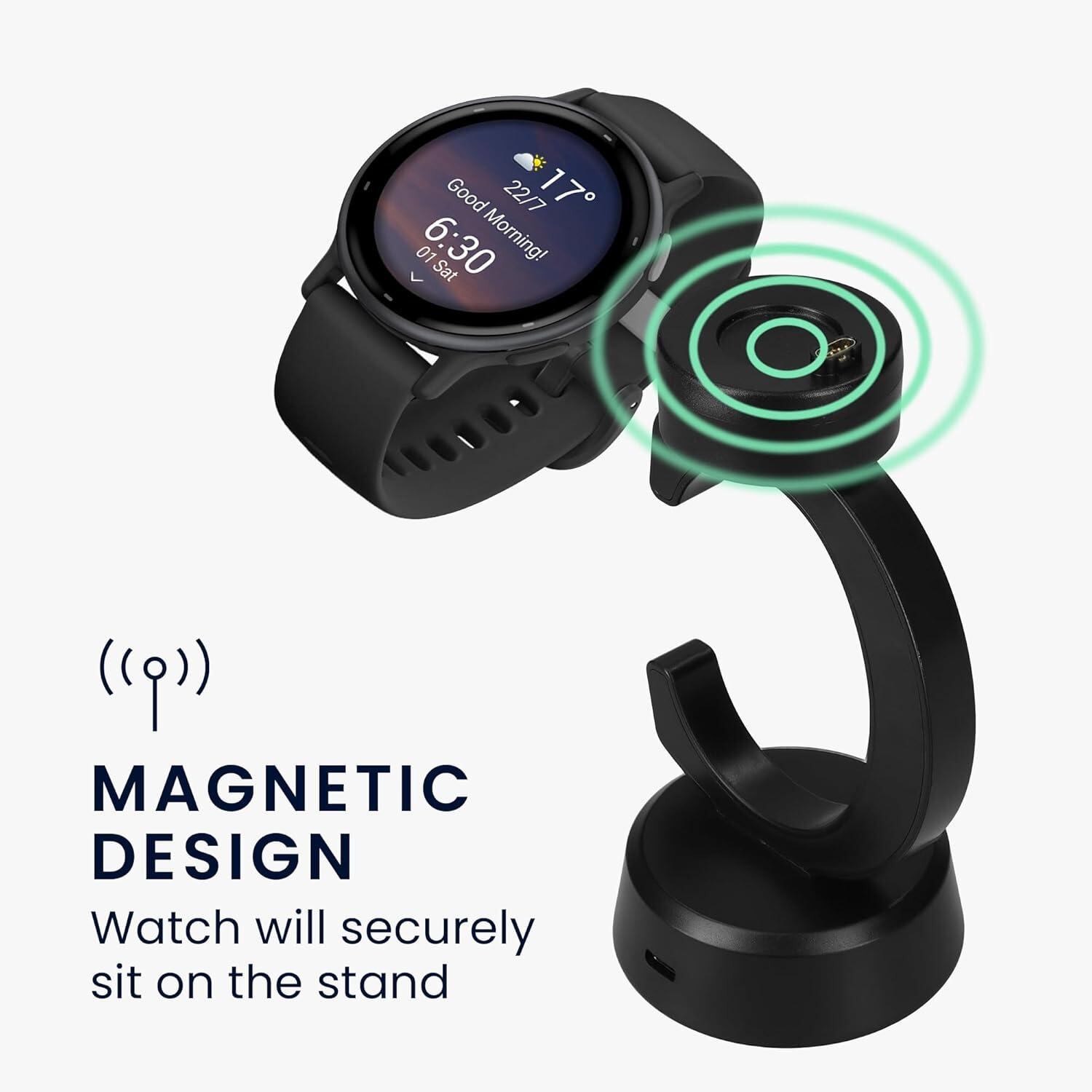見やすいスタンド: このアクティブトラッカー用充電器はスタンド式で、時計スタンドのように固定できます。12.6cmの高さにスマートウォッチを固定することで、通知や充電された量など、充電中でもランニングウォッチのディスプレイを快適に確認することができます。