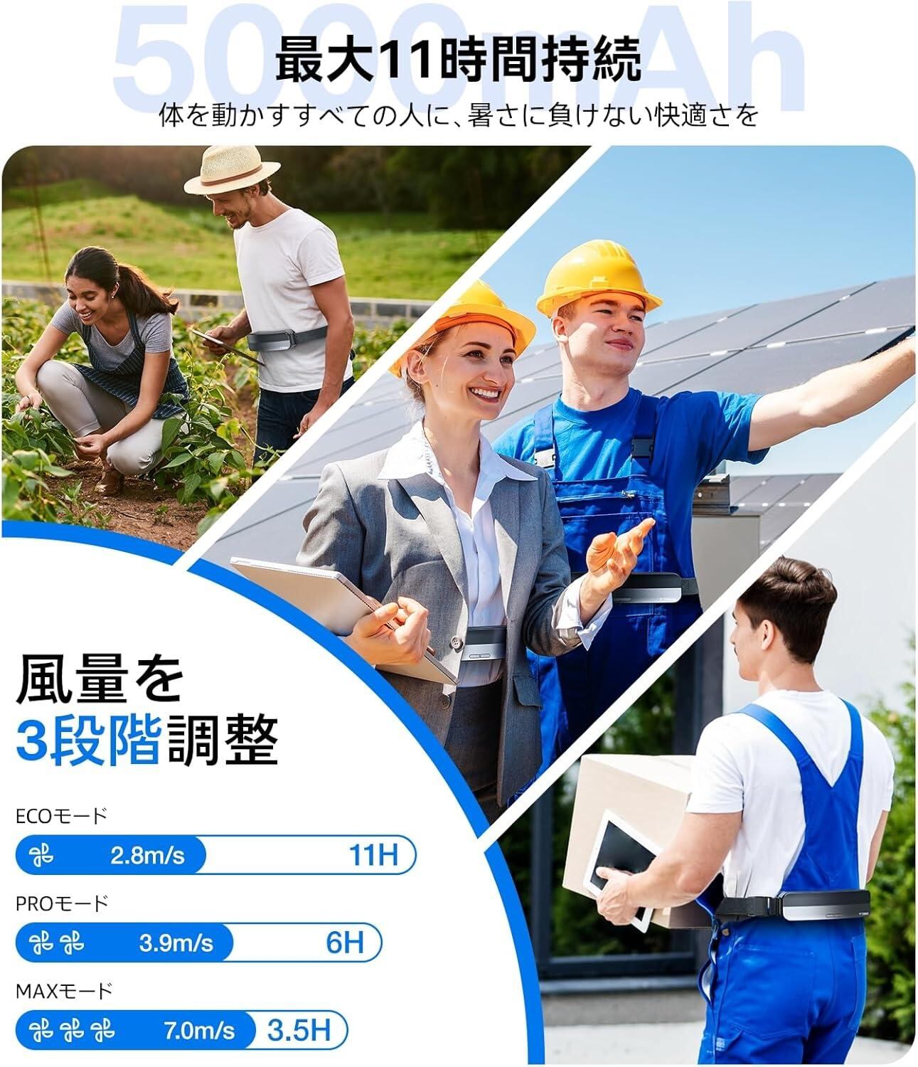 最大11h持続!最速2.5時間でフル充電!COOLiFY ZONE 3腰掛けファンには高密度積層バッテリーPSE/METI認証取得済が内蔵され、◼️5000mAhの大容量で最大11時間持続!◼️急速充電に対応、わずか2.5時間で満充電が可能。炎天下の作業やマラソンでも電力切れのストレスゼロ!◼️1.0m A-C急速充電ケーブル付属、充電しながら使用も可能。腰掛け扇風機 ベルトファンだけで冷え冷えに、夏を爽やかに駆け抜けよう~