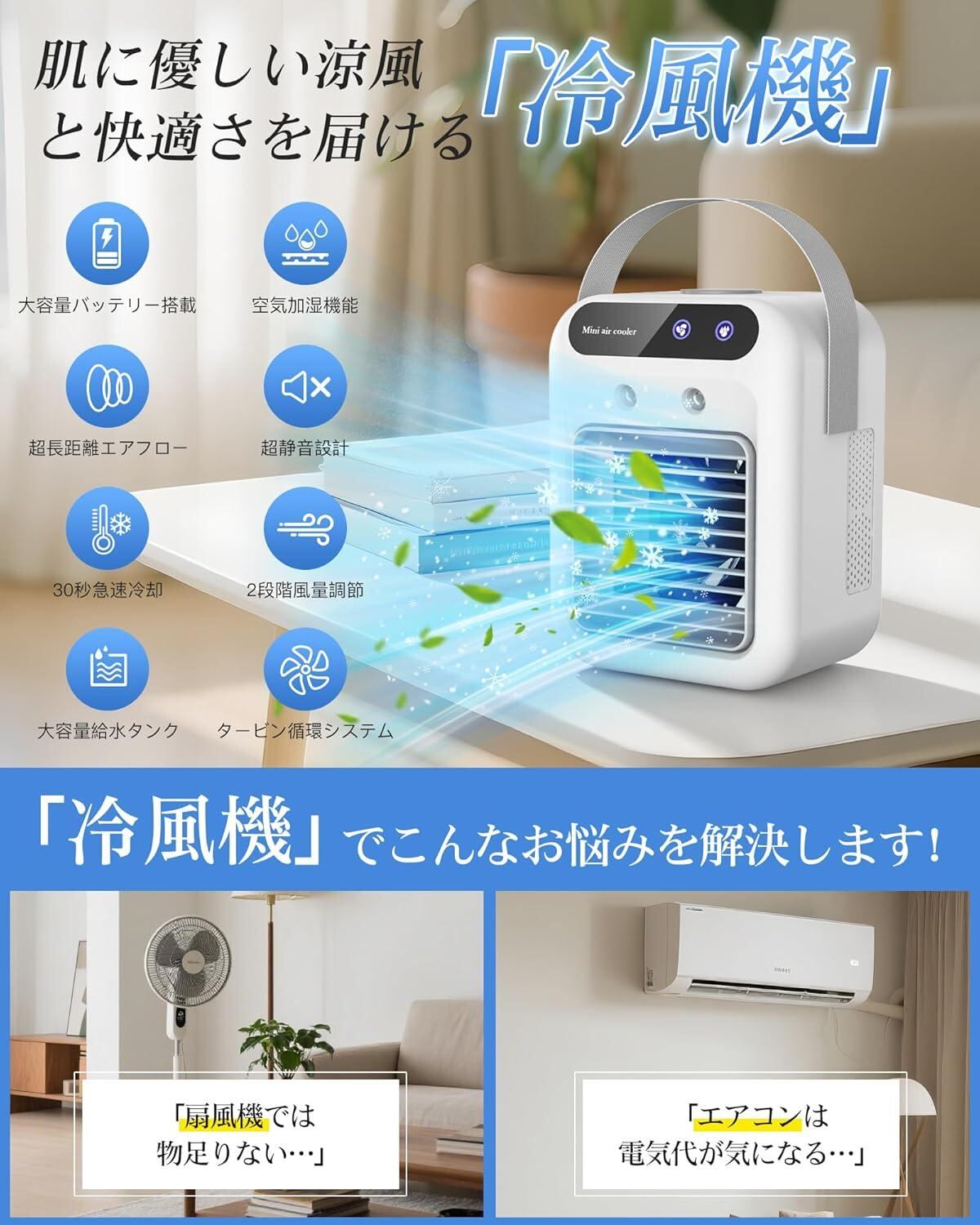 冷風機 冷風扇 2025高性能モデル・スマート操作卓上クーラー ミニエアコン 500ML大容量 上下角度調整 2段階風量 超音波式ミスト 加湿 冷却 空気清浄 抗菌 防カビ 静音設計 省エネ 氷入れ可