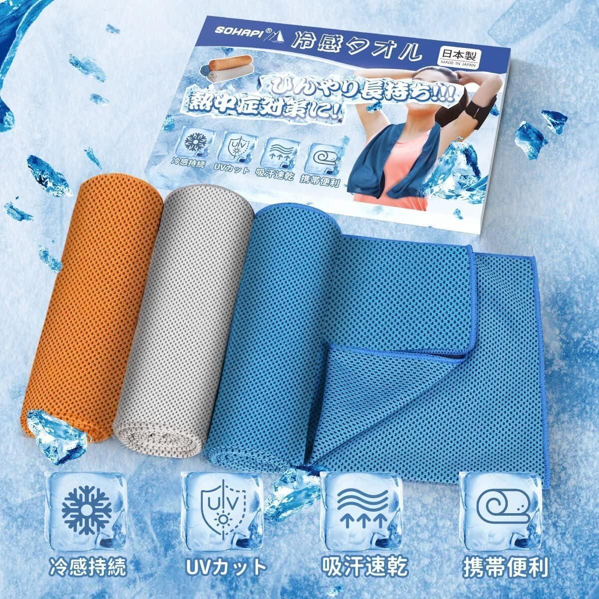 ひんやり長持ち❄冷感タオルAutoGo 冷感タオルはは安 心な日本製なので、細かな工夫が施されている商品だと自信を持ってお届けします。冷感タオルサイズ:約100CM*30CMの3色セットカラー:ブルー*1、グレー*1、オレンジ*1 素材:100%冷感繊維。暑い季節がやってきました。そんな暑い日で心配なのがやっぱり「熱中症対策」!そこでひんやりと冷たく気持ちがいい、暑い季節のクールダウンに!AutoGo 冷感タオル「クールタオル」が登場!冷感タオルを水に濡らして数回振るだけでひんやりします。「クールタオル」の秘密は100%冷感繊維の生地に使われている糸にあります。糸の断面は特殊な異形断面で、水や汗をすばやく吸収拡散します。冷感タオルから水が蒸発するときに、周りから熱を奪うという気化熱の作用で効率よく冷却効果が得られ、冷感タオルがすぐにひんやりと冷たくなるんです!また、冷感タオルをスポーツ等で使用する際は、汗をたくさん吸い取ることで、冷却力が持続するのが魅力です。