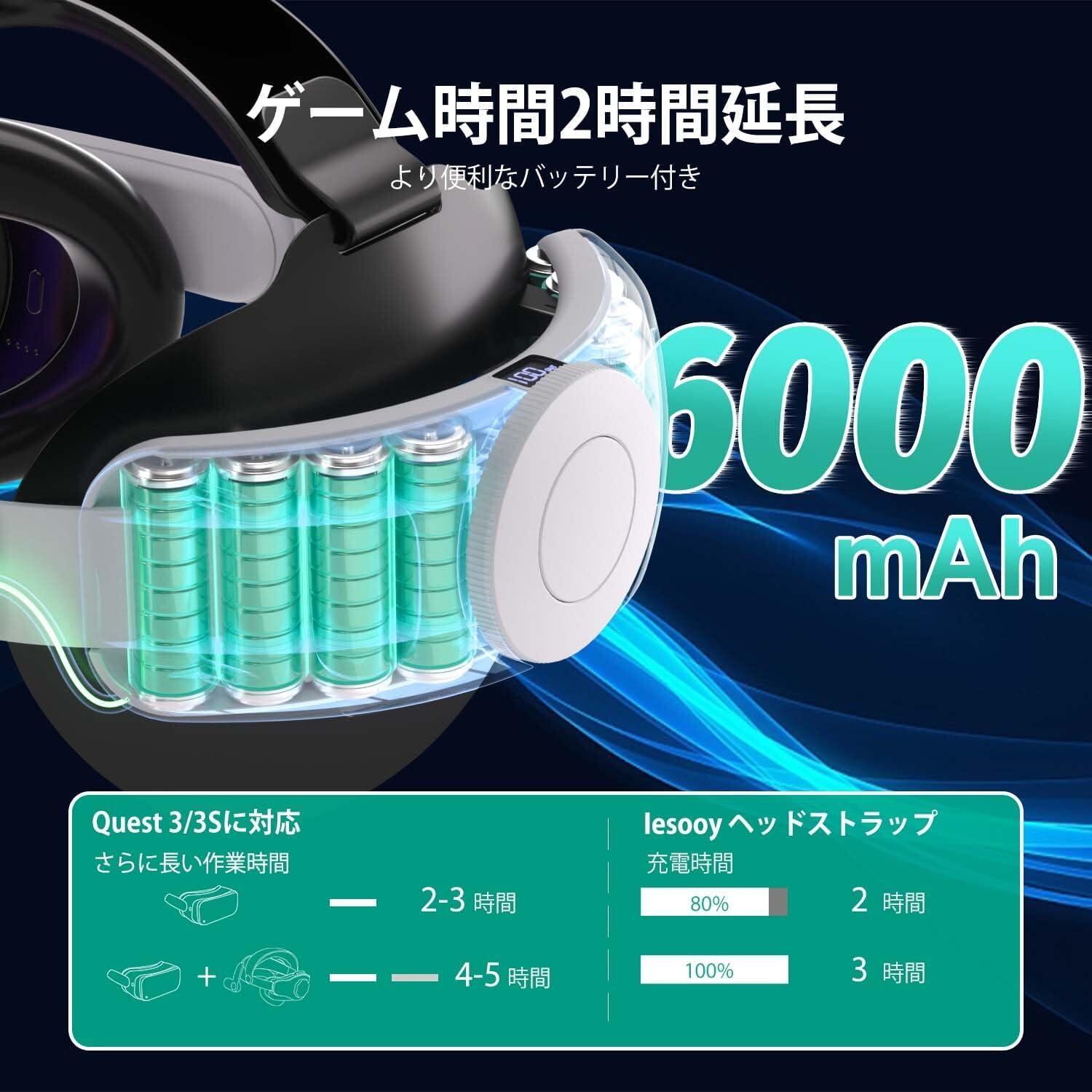 【継続的な電力供給】Quest 3/Quest 3S専用充電式ヘッドマウントには6000mAのバッテリーが搭載されていますが、ゲーム時間を延長し、本機の電力不足によるシャットダウンの問題を解決するのに役立ちます。
