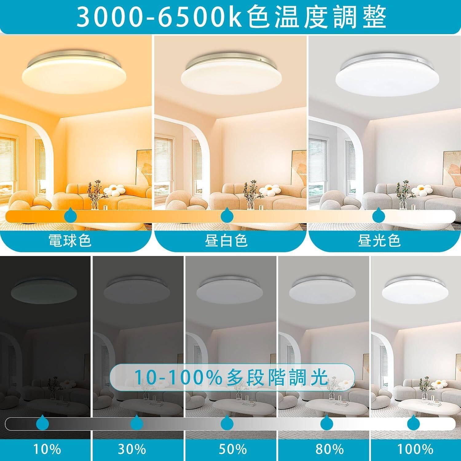 【リモコン付き&調光調色】LEDシーリングライトはの新型リモコンを採用しており单3形乾電池別途購入が必要,天井照明器具は10段階調光12段階調色可能、。高輝度な智能LEDチップを搭載しており、光がより安定していて明るいです。コンパクトな外観。シーンや雰囲気やお好みに合わせて明るさを調節できる。明るさボタンを長押しと、無段階調光調色ができます。