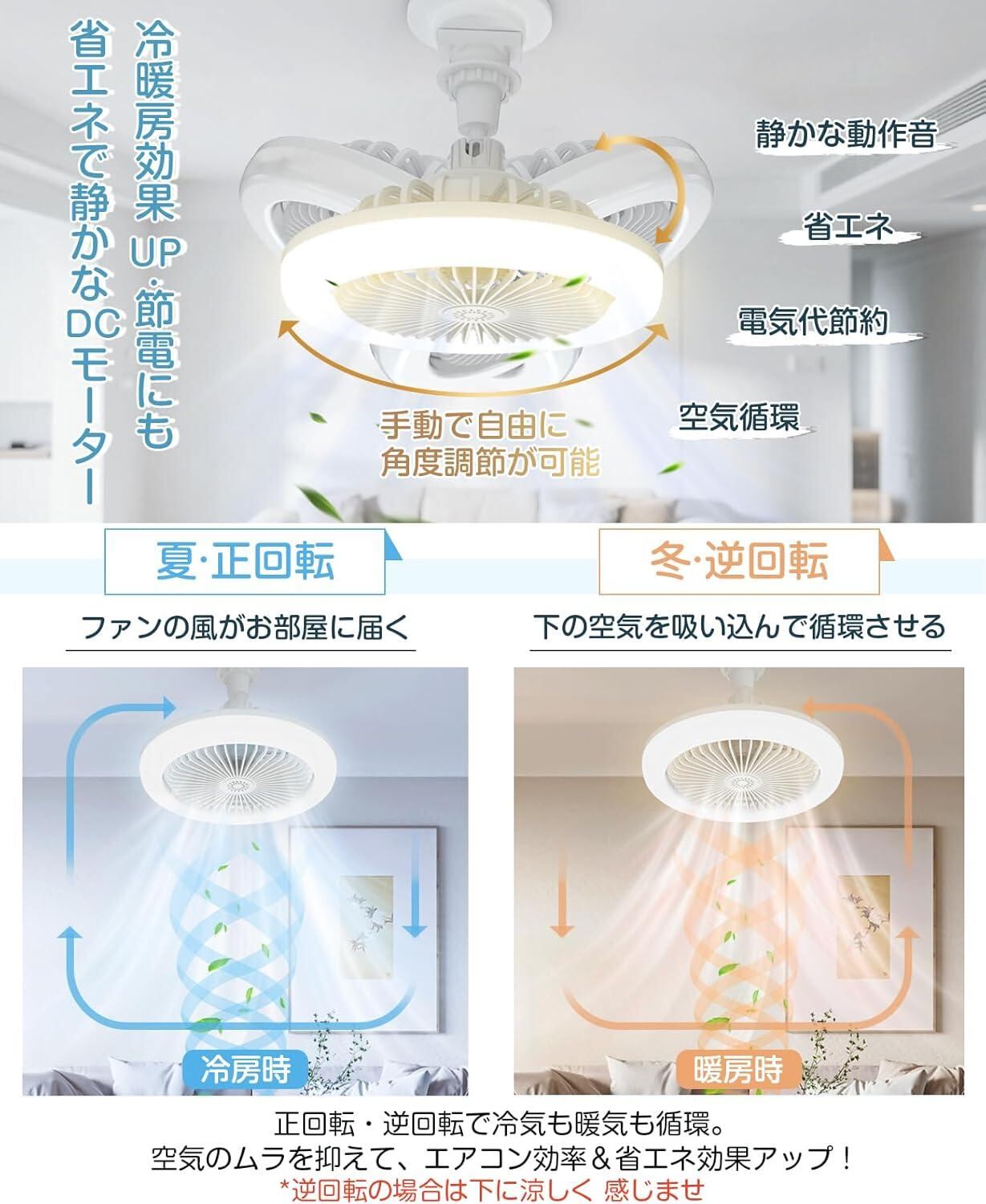 【光×風×空気循環・ 一台三役ファン一体型ライト】「ファン」と「LEDライト」を一体型したLEDシーリングファンライトは天井から部屋の隅々まで新鮮な空気を送り届けるだけでなく、優しい微風と柔らかな光を提供します。この画期的なシーリングファンライトは、夏の熱中症対策と省エネ効果を同時に実現する、快適な暮らしの新必需品です。夏は涼風、冬は暖風で一年中快適な環境を提供。天井ファンライトは部屋全体の空気を効率的に循環させ、温度ムラを解消します。従来モデル比で風量と明るさが大幅アップし、メモリー機能やより頑丈なE26口金など新機能を追加。これまでにない快適さをお届けします!