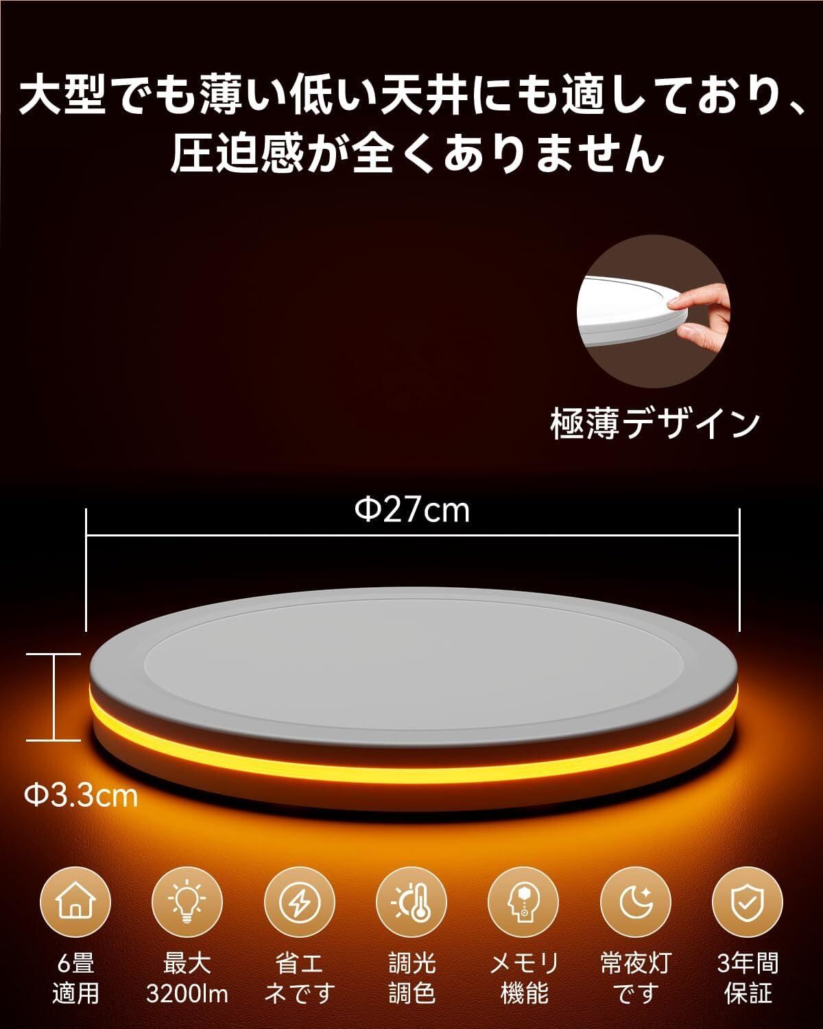 極薄デザイン: 27273.3cmのスリムなデザインで、天井にぴったりと収まり、空間を無駄にしません。6畳の部屋に最適で、広々とした心地よい光をお楽しみいただけます。