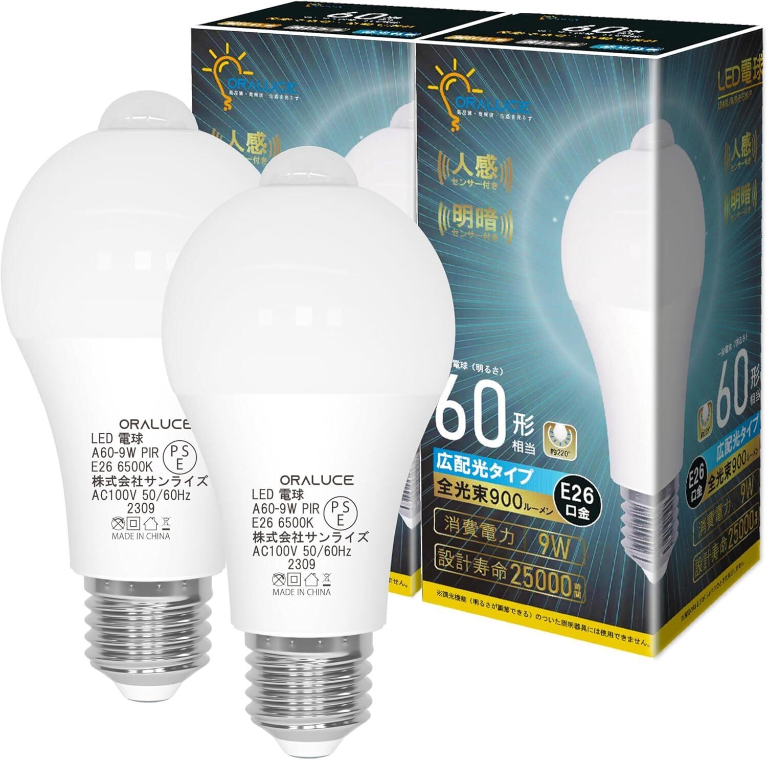 ORALUCE LED電球 E26口金 人感センサー 電球 60W形相当 昼光色 6500K 9W 900lm 自動点灯・消灯 明暗センサー付 消し忘れ防止 階段 玄関 廊下 トイレ 調光不可 2個入