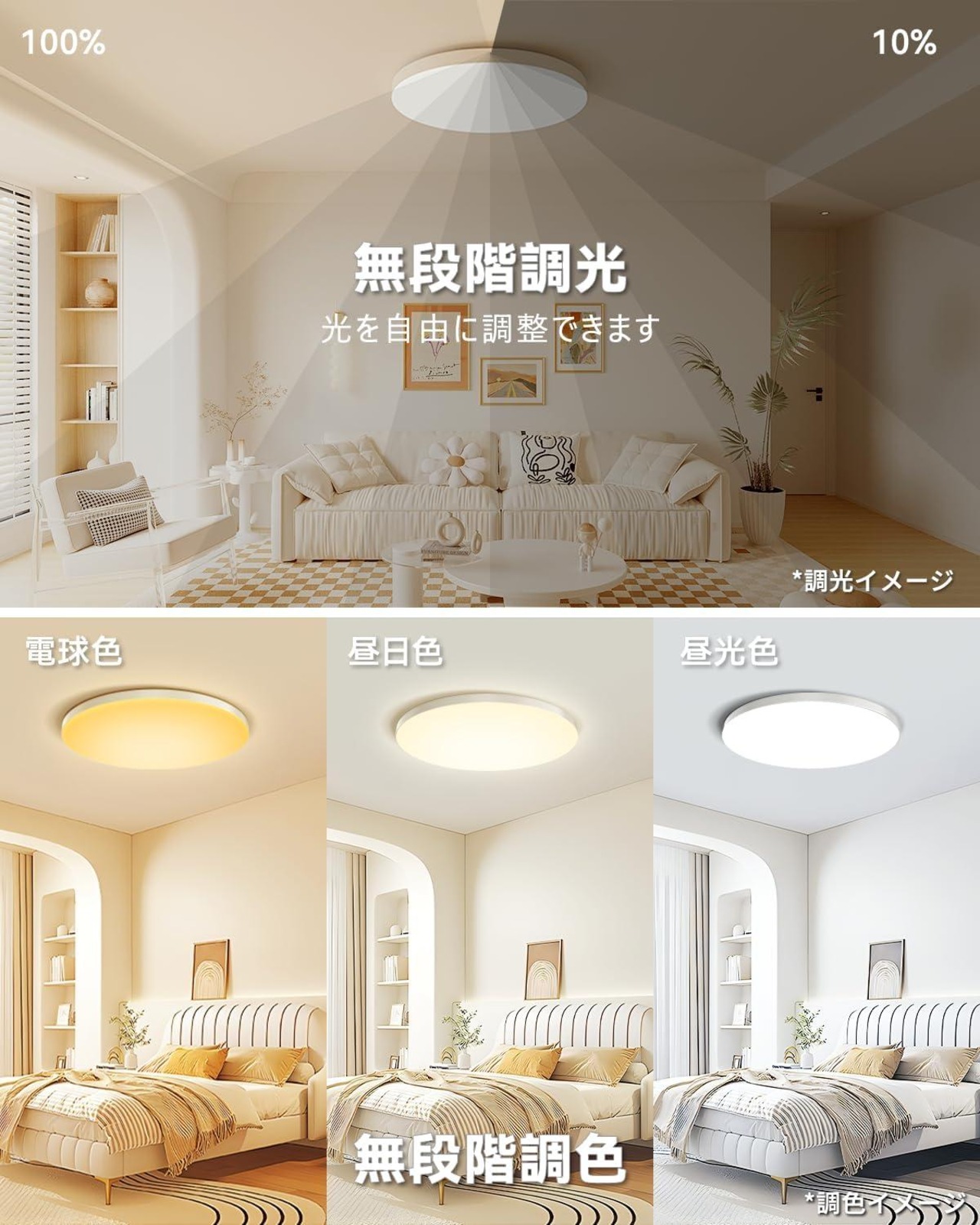 【12段階調光+8段階調色】○ 精密調光:リモコンで12段階の明るさ調節10%~100%と7段階の色温度調節電球色3000K~昼光色6500Kが可能です。勉強・読書時は爽やかな昼光色に、家族団らんやリラックスタイムには温もりのある電球色に切り替えられ、リビング・キッチン・寝室・書斎など、あらゆるシーンに対応。1台で多彩な光環境を実現します。 ○ ワンタッチ切替:リモコンまたは壁スイッチで、電球色/昼白色/昼光色の3パターンを即時切り替え可能。