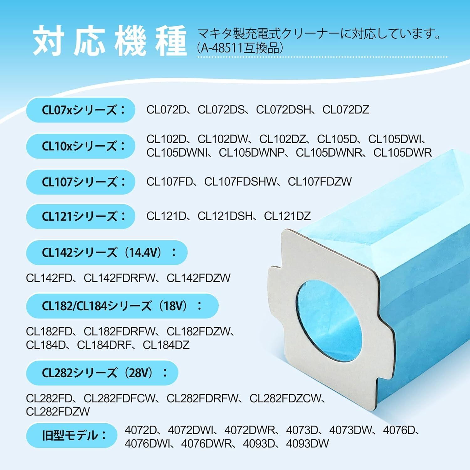 【対応機種】 本製品は以下のマキタ製充電式クリーナーに対応しています。 CL07xシリーズ:CL072D、CL072DS、CL072DSH、CL072DZ CL10xシリーズ:CL102D、CL102DW、CL102DZ、CL105D、CL105DWI、CL105DWNI、CL105DWNP、CL105DWNR、CL105DWR CL107シリーズ:CL107FD、CL107FDSHW、CL107FDZW CL121シリーズ:CL121D、CL121DSH、CL121DZ CL142シリーズ14.4V:CL142FD、CL142FDRFW、CL142FDZW CL182/CL184シリーズ18V:CL182FD、CL182FDRFW、CL182FDZW、CL184D、CL184DRF、CL184DZ CL282シリーズ28V:CL282FD、CL282FDFCW、CL282FDRFW、CL282FDZCW、CL282FDZW 旧型モデル:4072D、4072DWI、4072DWR、4073D、4073DW、4076D、4076DWI、4076DWR、4093D、4093DW ※上記以外の機種には対応していない場合がありますので、ご購入前に必ずご確認ください。