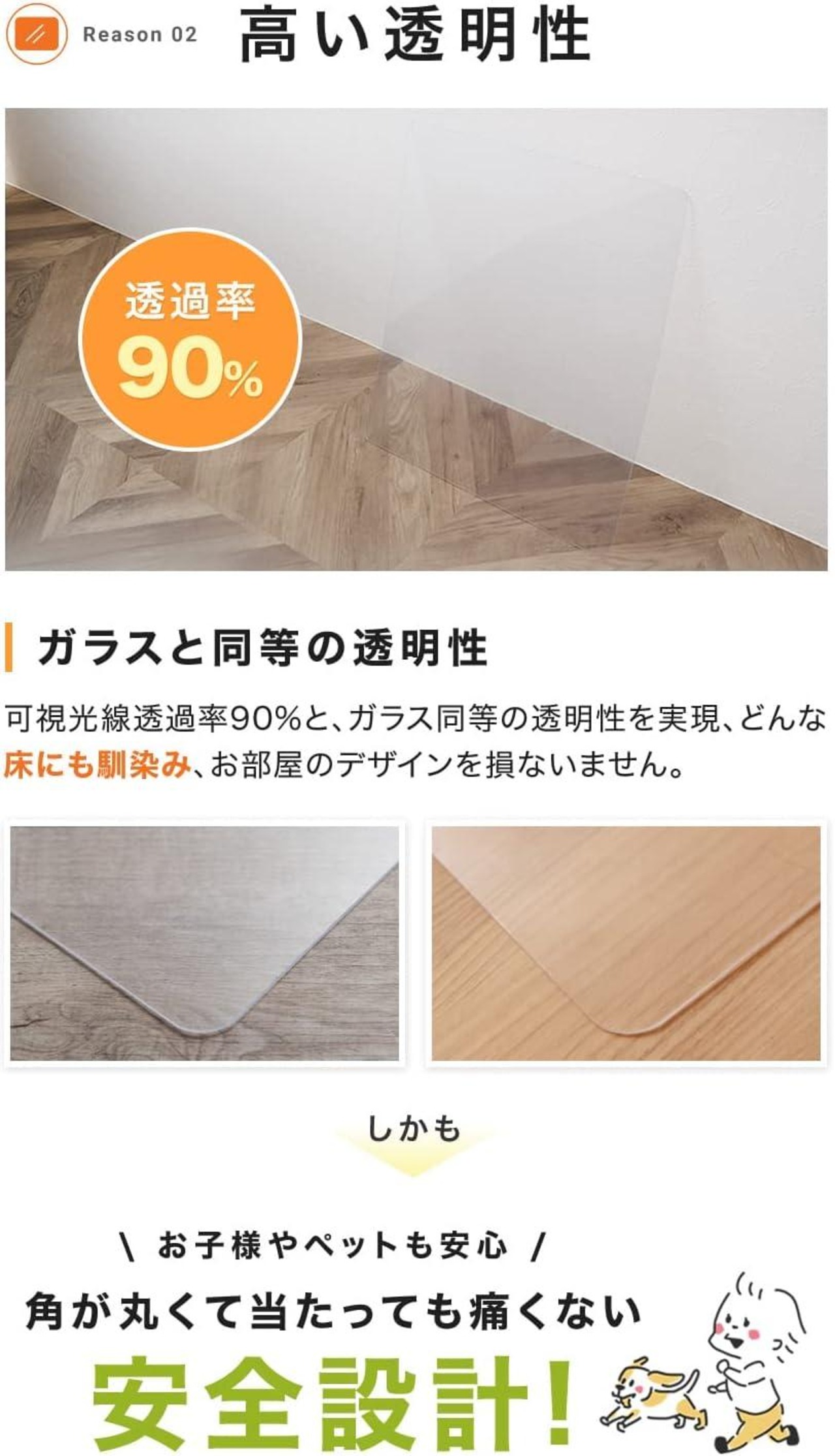 【防弾シールドに使用される程の強度】"ガラスの250倍"の強度を誇り、ハンマーなどで強打しても割れません!地震が起きても破損・飛散することがなく、 冷蔵庫 を置いた時にできる 傷 や 凹み から床を守ります!従来品より厚みが増し、さらに床への キズ防止 効果がアップ!重さわずか997gでMサイズ女性でも簡単に設置できます 【ガラスと同等の透明性】可視光線透過率80-90%と、ガラス同等の 透明 性を実現!どんな床にも馴染み、お部屋のデザインを損ないません。
