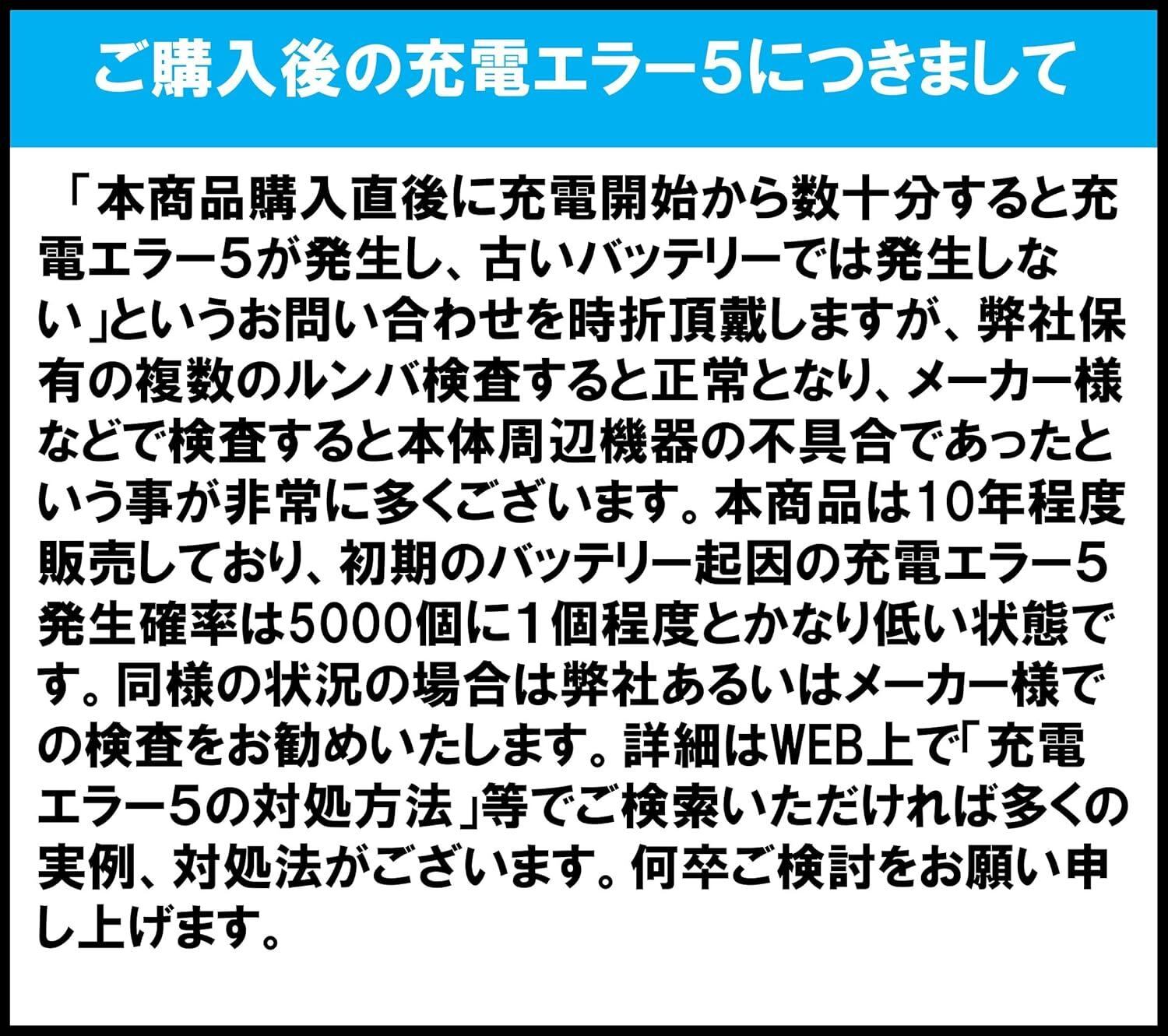 【寿命】従来品よりさらに長寿命を誇ります。1年に1回バッテリーを交換するよりも断然経済的でストレスフリーを実現する高性能バッテリーです。 ※「本商品購入直後に充電開始から数十分すると充電エラー5が発生し、古いバッテリーでは発生しない」というお問い合わせを時折頂戴しますが、弊社保有の複数のルンバ検査すると正常となり、メーカー様などで検査すると本体周辺機器の不具合であったという事が非常に多くございます。本商品は10年程度販売しており、初期のバッテリー起因の充電エラー5発生確率は5000個に1個程度とかなり低い状態です。同様の状況の場合は弊社あるいはメーカー様での検査をお勧めいたします。詳細はWEB上で「充電エラー5の対処方法」等でご検索いただければ多くの実例、対処法がございます。何卒ご検討をお願い申し上げます。