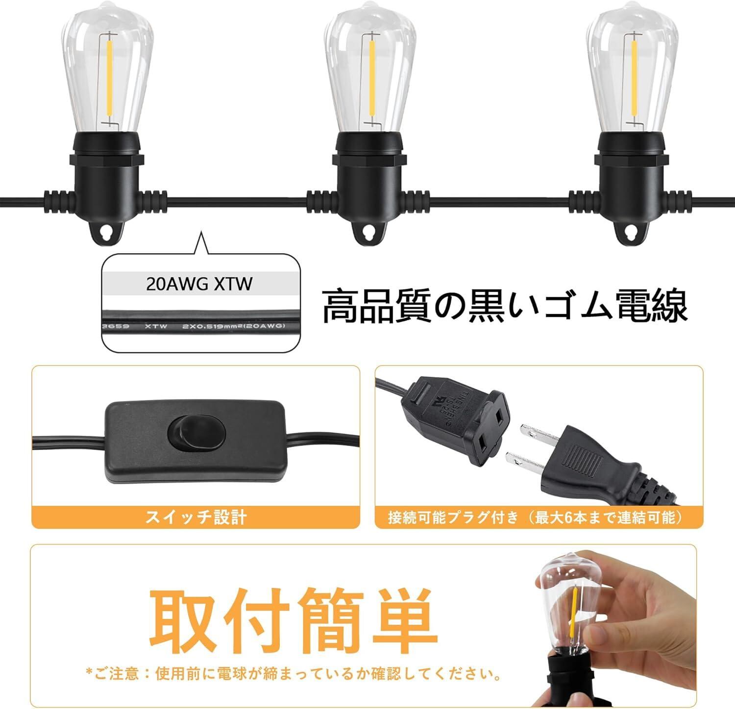 『延長コード・スイッチ付き』:LEDイルミネーションライトにはスイッチ付きの1m延長コードを配し、点灯しやすい。延長コードを個別に購入する必要はありません。消灯時はスイッチを押すだけで閉まり、プラグを抜く必要はありません。付きの連結プラグには長さ延長できます。最大6本まで連結可能。弊社のストリングライトは2つの電球を追加配送しており、使用中に壊れた電球は予備電球で交換できるので使いやすい。