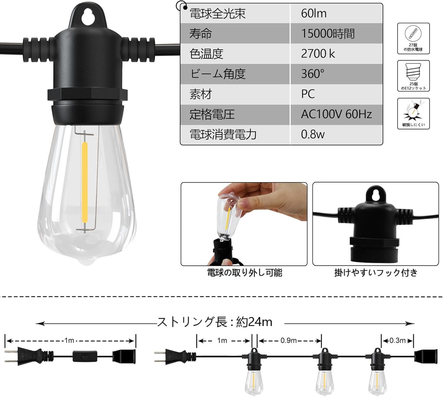 『商品仕様』:ストリング長:23m、延長コード長:1m、ソケット間隔:0.9m、電球消費電力:0.8w 省エネ96%、定格電圧:AC100V 50/60Hz、電球全光束:60lm、色温度:2700k、ビーム角度:360º、口金サイズ:E12、電球数:25個+2個付き、ソケット個数:25個、防水等級:IP65