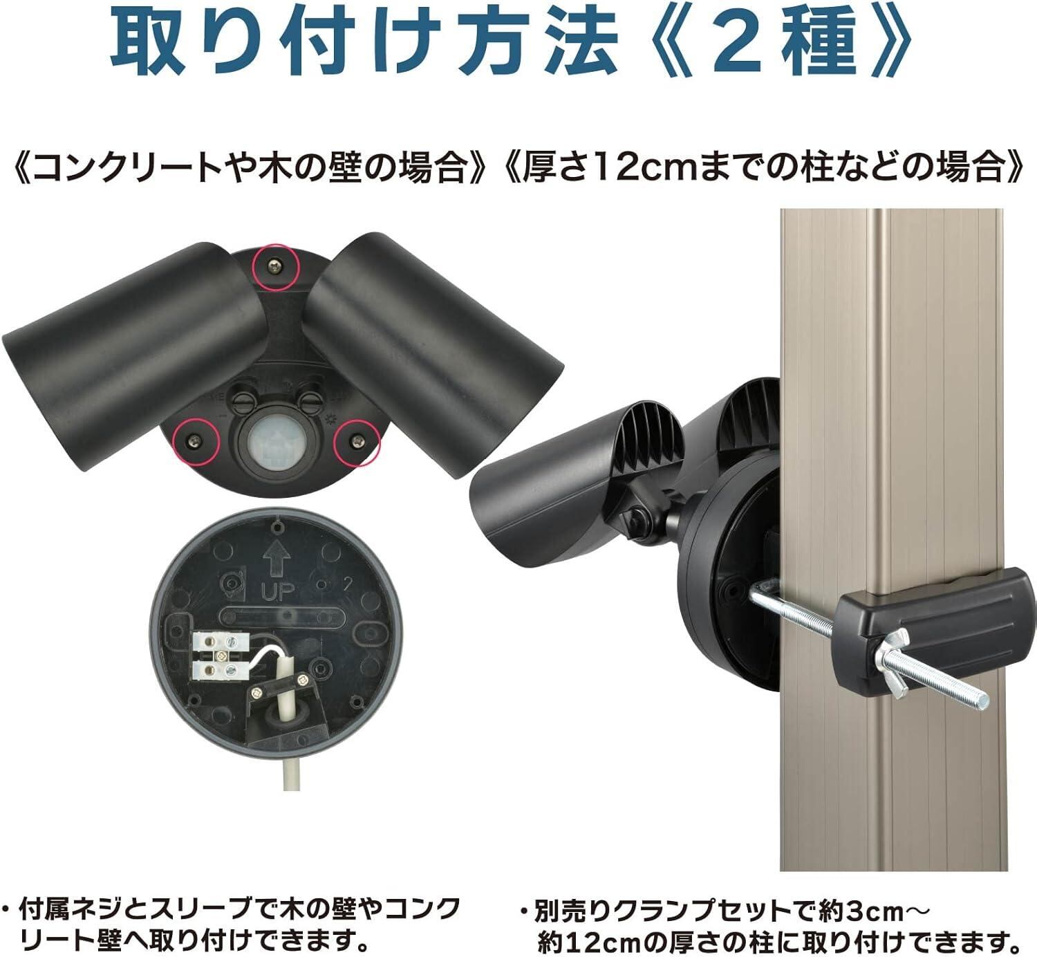 弊社別売クランプセット品番:07-8285/型番:OSE-SCS1Dで 柱に取付可能【 仕 様 】■ 検知方式:赤外線受動式■ 使用電源:AC100V 50/60Hz■ 消費電力:約20W待機時 約1W■ 光源:白色LED全光束 約2000ルーメン■ 点灯保持時間:約10秒~約4分■ 外来固形物に対する保護・水に対する保護:IPX4あらゆる方向からの水の飛まつに対する保護等級※JIS C0920:2003による
