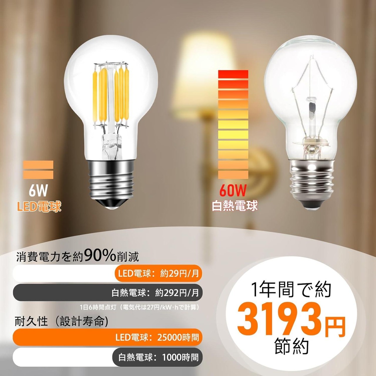 ◎省エネ・耐久性:フィラメント電球の消費電力はわずか6Wで、従来の60W白熱電球に相当する。消費電力は約142lm/Wで、従来の白熱電球より90%の消費電力を節約し、より少ない熱を発生させ、使用寿命を延長した。設計寿命は25,000hに達し、頻繁に電球を交換する必要はありません。